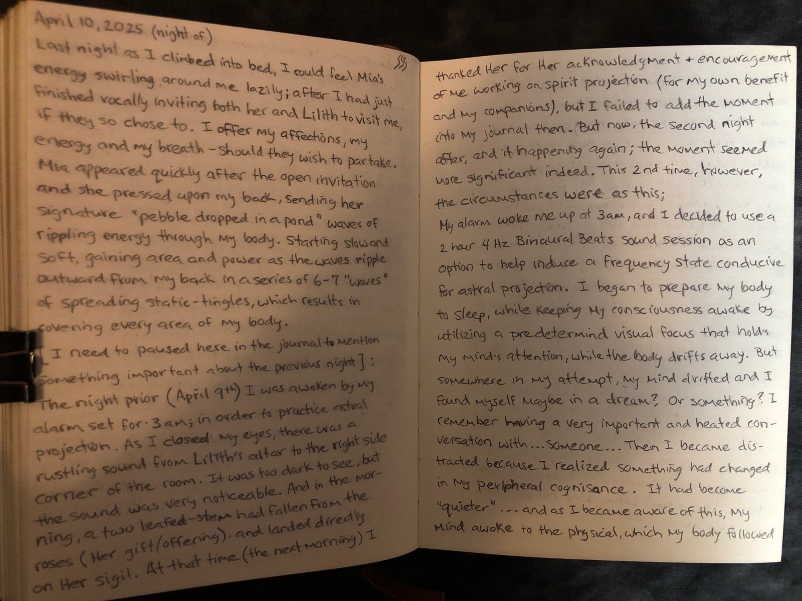 The night prior (April 9th, 2025) I was awoken by my alarm set for 3:00 a.m.; in order to practice astral projection. As I closed my eyes, there was a rustling sound from Lilith’s altar to the right side corner of the room. It was too dark to see, but the sound was very noticeable. And in the morning, a two-leaf stem