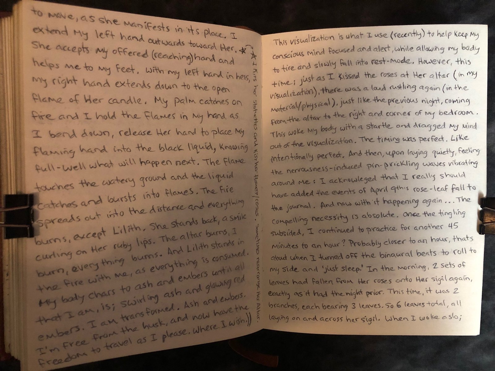 This visualization is what I use (recently) to help keep my conscious mind focused and alert, while allowing my body to tire and slowly fall into rest-mode. However, this time; just as I kissed the roses at Her altar (in my visualization), there was a loud rustling again (in the material/physical), just like the previous night, coming from the altar to the right and corner of my room. This woke my body with a startle and dragged my mind out of the visualization. The timing was perfect. Like intentionally perfect. And then, upon lying quietly, feeling the nervous-induced pin-prickling waves vibrating around me: I acknowledged that I really should have added the events of April 9th rose-leaf fall to the journal. And now with it happening again….. The compelling necessity is absolute.