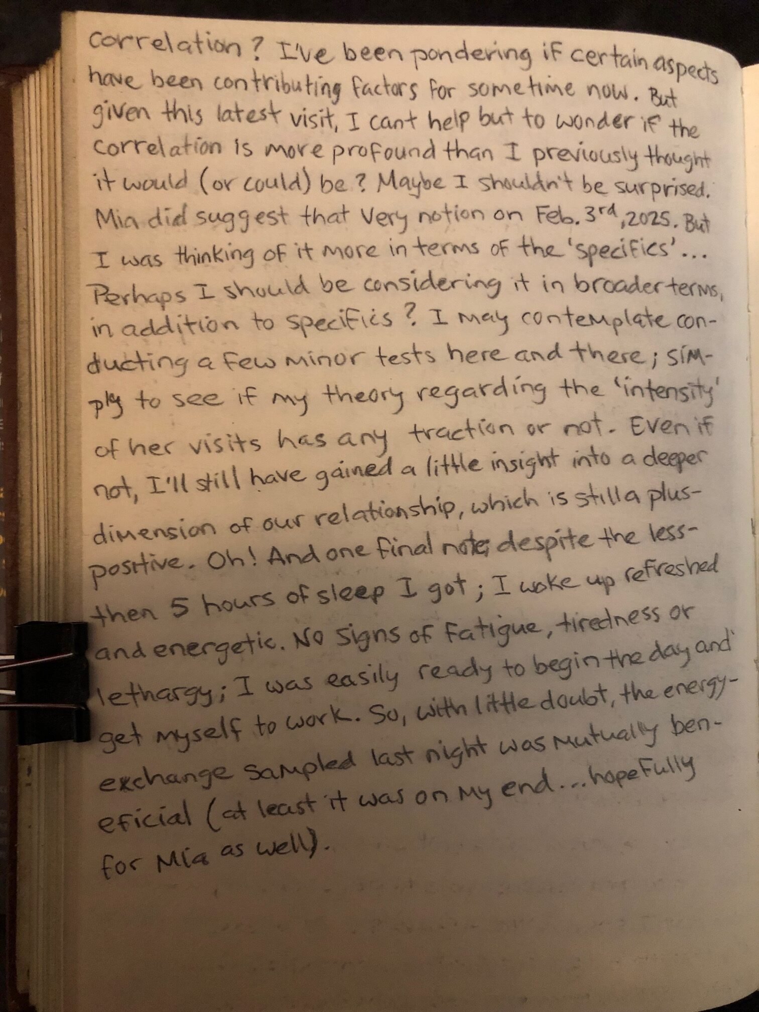 I have been curious about the association between the timing of her more ‘potent’ visits and other external factors experienced here in the material. Perhaps there is a correlation? I’ve been pondering if certain aspects have been contributing-factors for some time now. But given this last visit, I cant help to wonder if the correlation is more profound than I previously thought it would (or could) be? Maybe I shouldn’t be surprised. Mia did suggest that very notion on Feb. 3rd, 2025. But I was thinking of it more in terms of the ‘specifics’… Perhaps I should be considering it in broader terms, as well as in specifics?