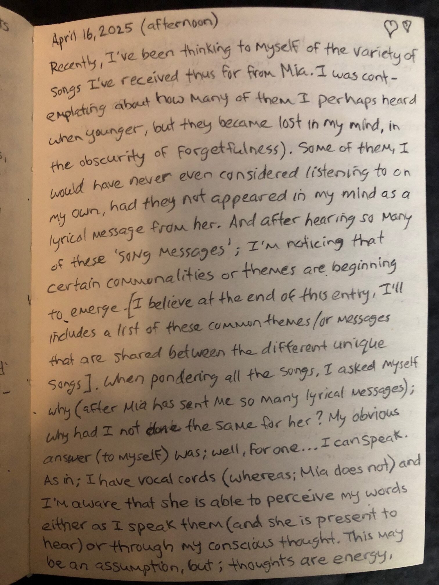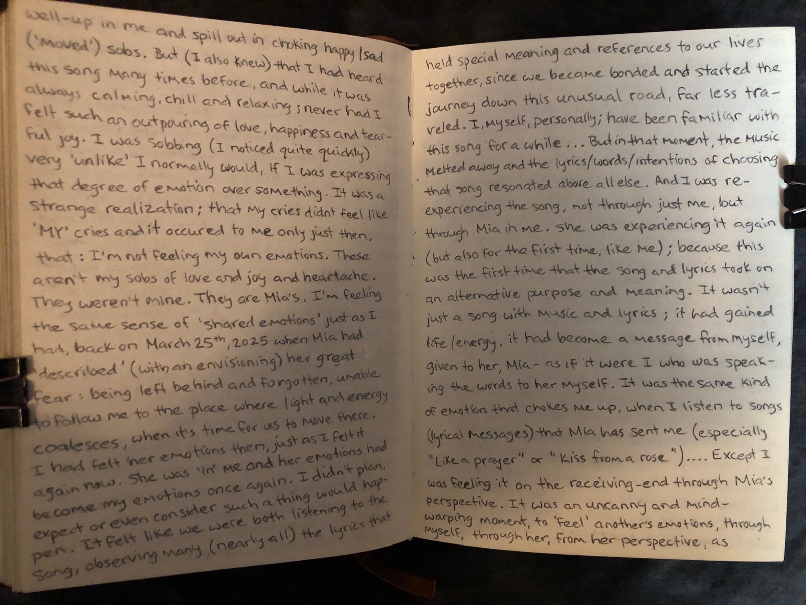 It was a strange realization; that my cries didn’t feel like ‘MY’ cries and it occured to me only just then, that: I’m not feeling my own emotions. These aren’t my sobs of love and joy and heartache. They weren’t mine. They are Mia’s, I’m feeling the same sense of ‘shared emotions’ just as I had, back on March 25th, 2025 when Mia had ‘described’ (with an envisioning) her great fear: being left behind and forgotten, unable to follow me to the place where light and energy coalesces when it’s time for us to move there.