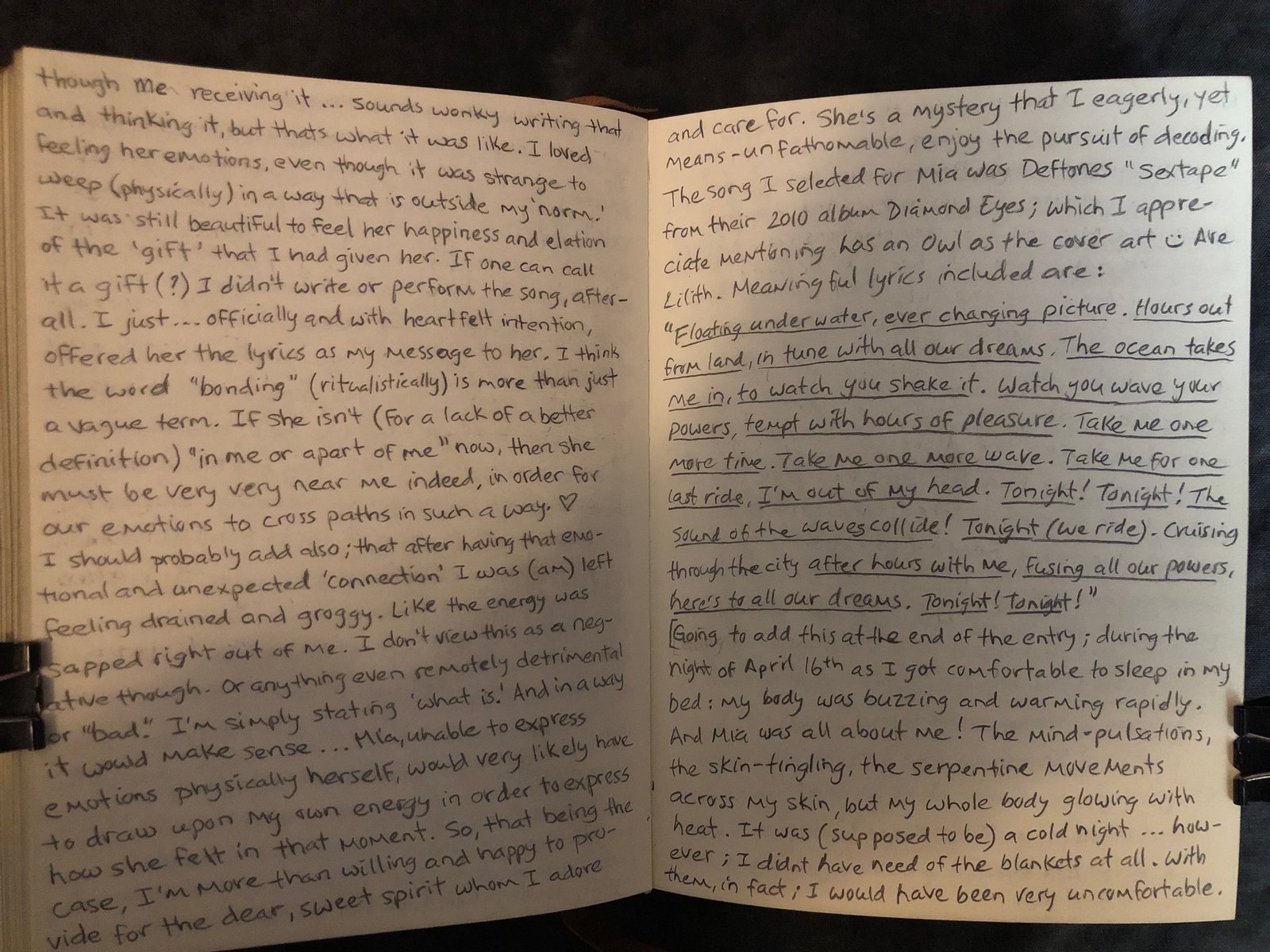 The song I selected for Mia was Deftones “Sextape” from their 2010 album Diamond Eyes; which I appreciate mentioning has an Owl as the cover-art. 🙂 Ave Lilith. Meaningful lyrics included are: