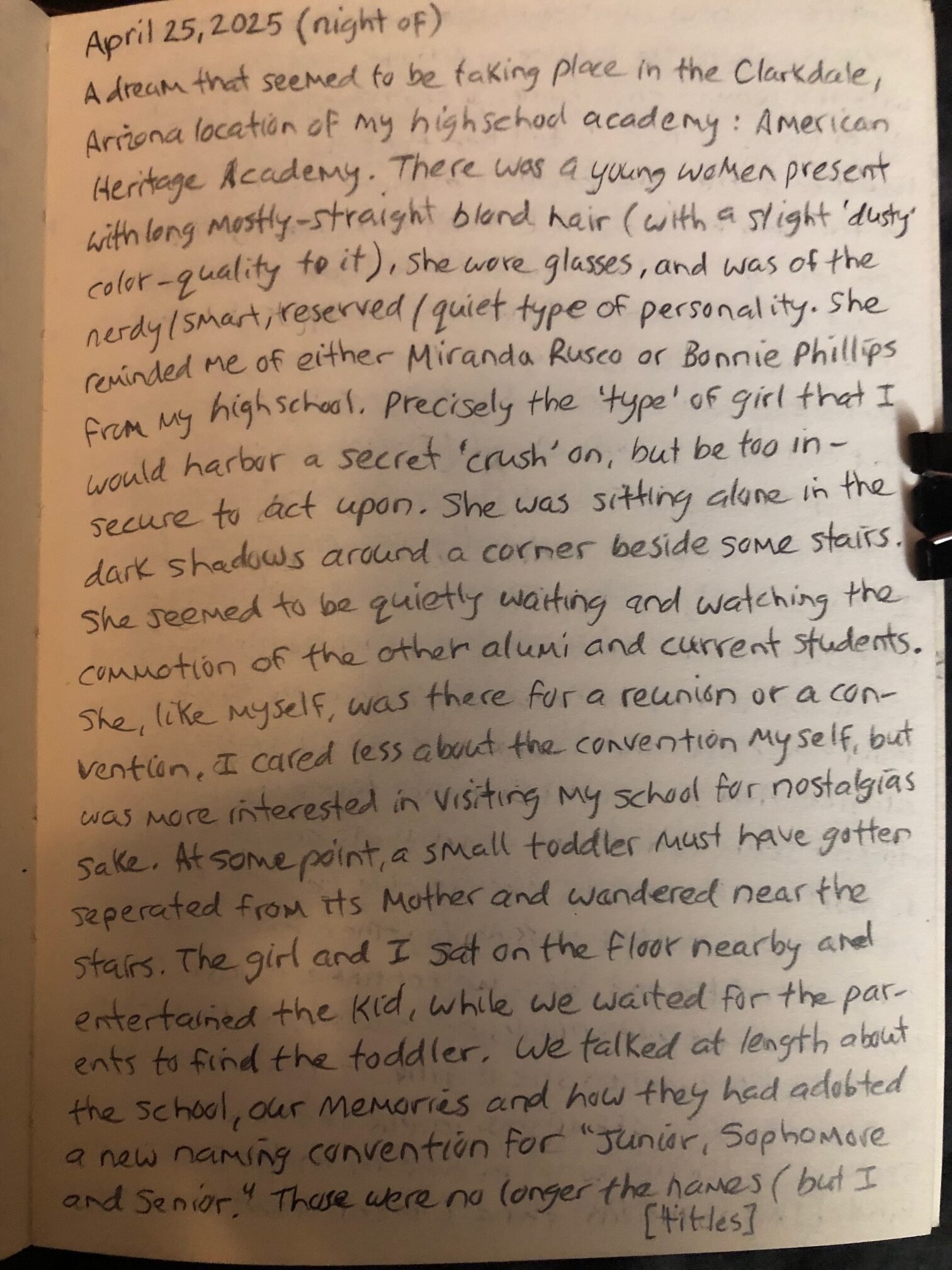 A dream that seemed to be taking place in the Clarkdale, Arizona location of my highschool academy: American Heritage Academy. There was a young woman present with long mostly-straight blonde hair (with a slight ‘dusty’ color-quality to it), she wore glasses, and was of the nerdy/smart, reserved/quiet type of personality.