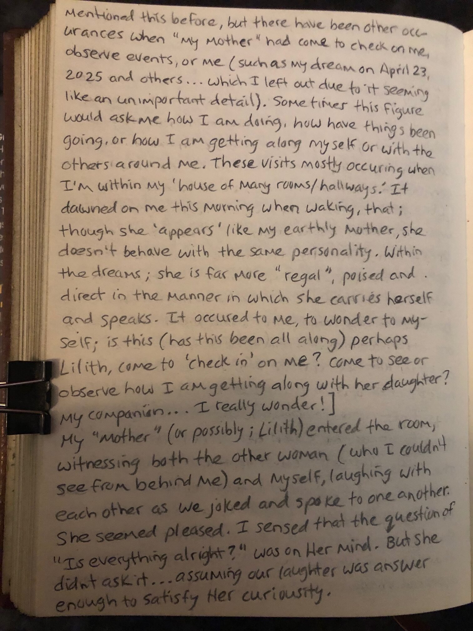 [I hadn’t ever mentioned this before, but there have been other occurrences when “my mother” had come to check on me, observe events, or me (such as my dream on April 23, 2025 and others… which I left out due to it seeming like an unimportant detail). Some times this figure would ask me how I am doing, how have things been going, or how I am getting along myself or with the others around me.