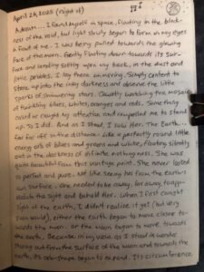 The earth took up the entire view and I couldn’t look away. She was so close that I felt… if I leapt from the moon now, certainly I would get caught in Her gravity and pulled towards Her. So I did. I bent my knees low and leapt straight up and out towards the earth. Smoothly and gracefully I ascended “upwards” (outwards) and drifted towards Her.