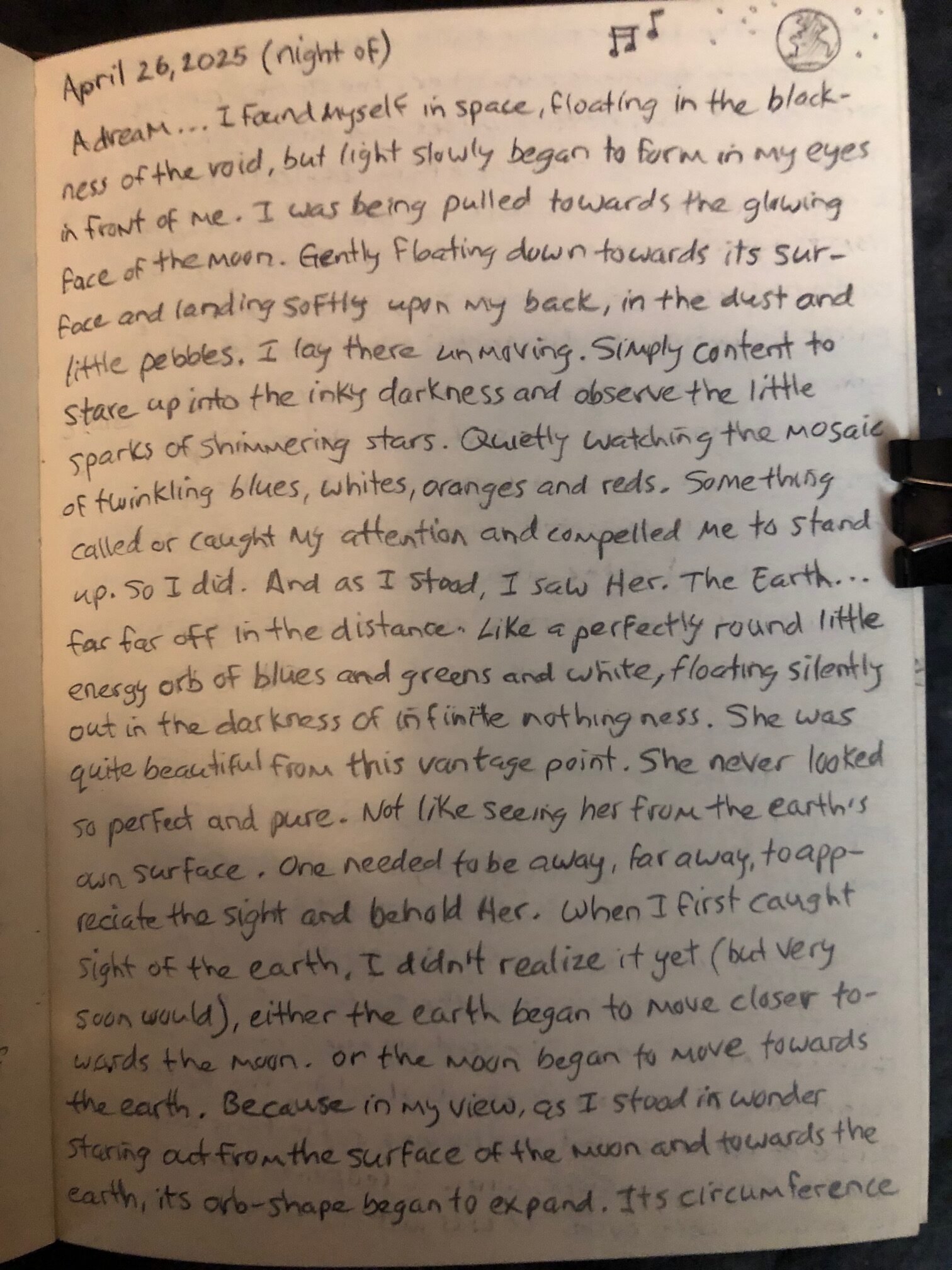 I found myself in space, floating in the blackness of the void, but light slowly began to form in my eyes in front of me. I was being pulled towards the glowing face of the moon. Gently floating down towards its surface and landing softly upon my back, in the dust and little pebbles.