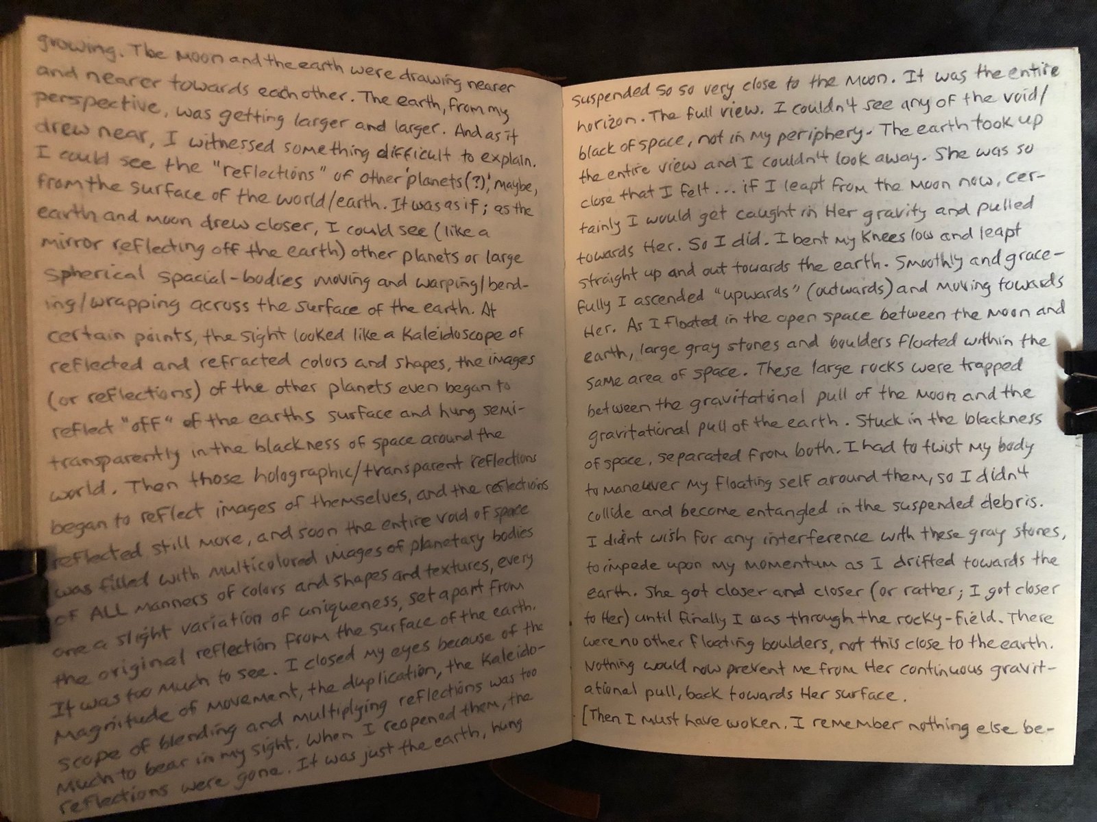 It was too much to see. I closed my eyes because of the magnitude of movement, the duplication, the kaleidoscope of blending and multiplying reflections was too much to bear in my sight. When I reopened them (*my eyes*), the reflections were gone. It was just the earth, hung suspended so so very close to the moon. It was the entire horizon. The full view. I couldn’t see any of the void/ black of space, not in my periphery.