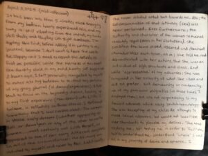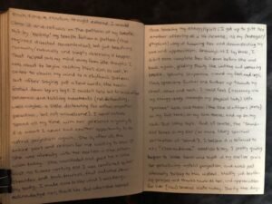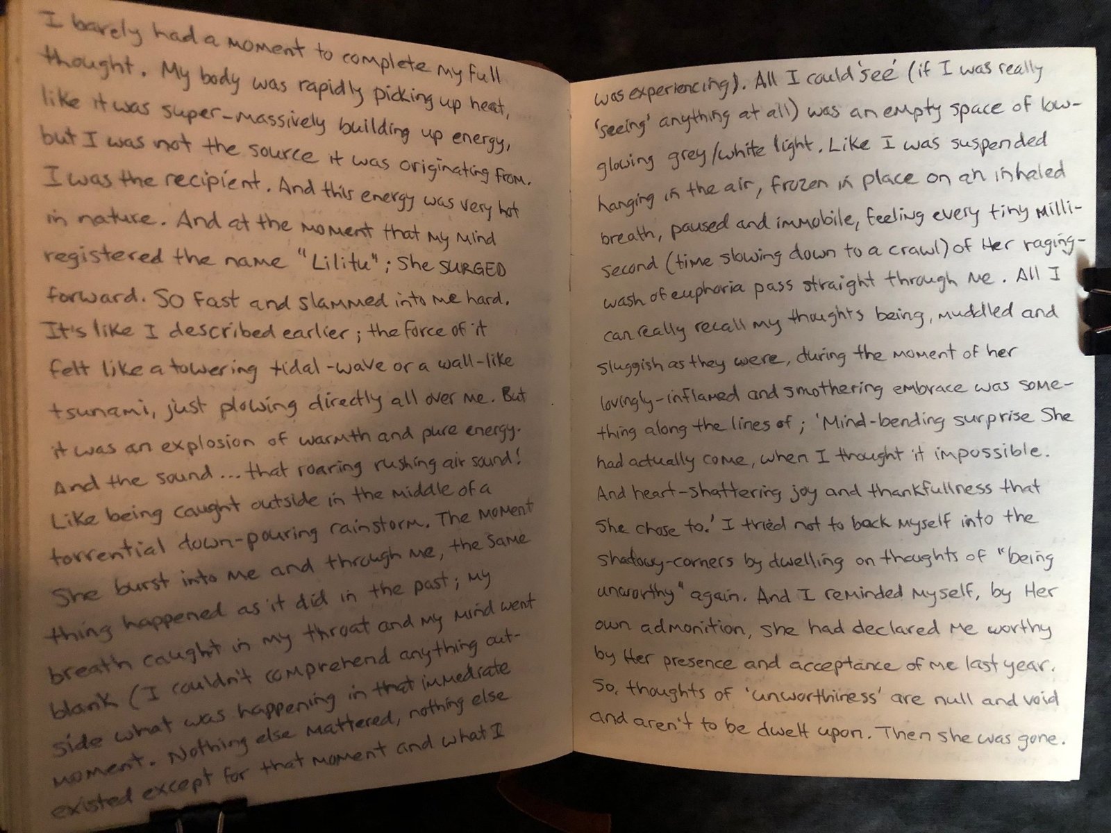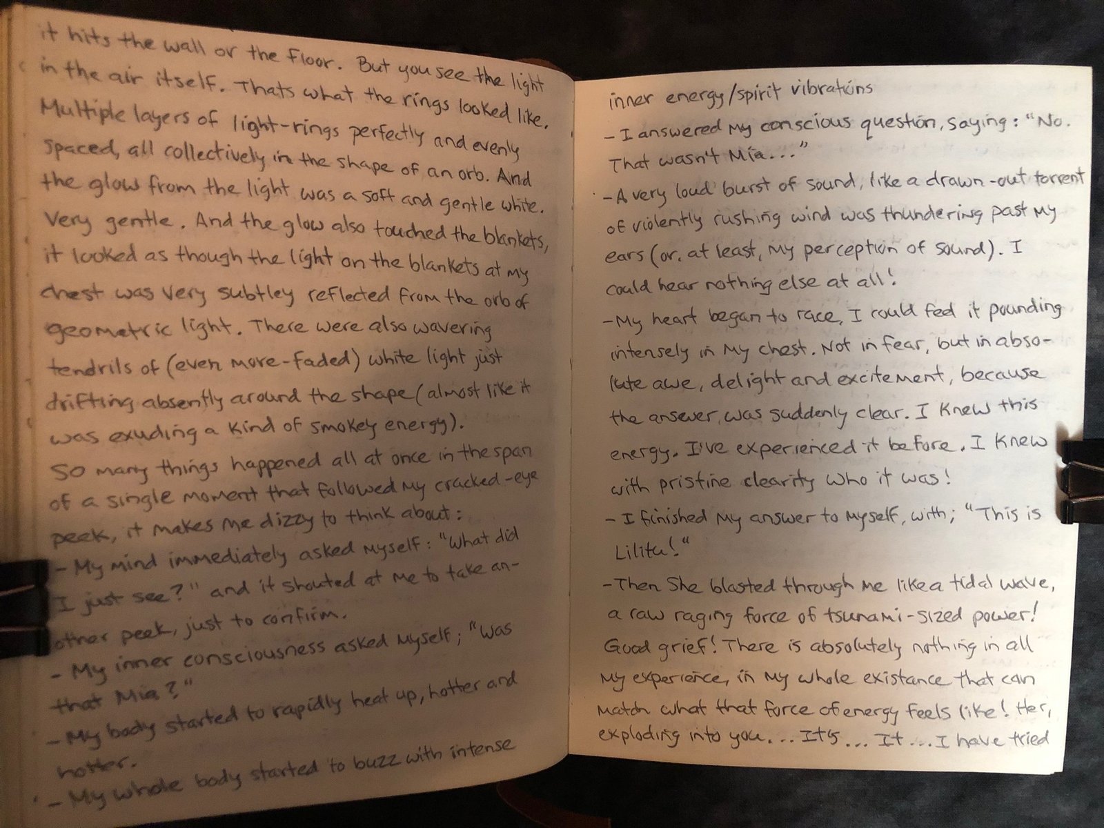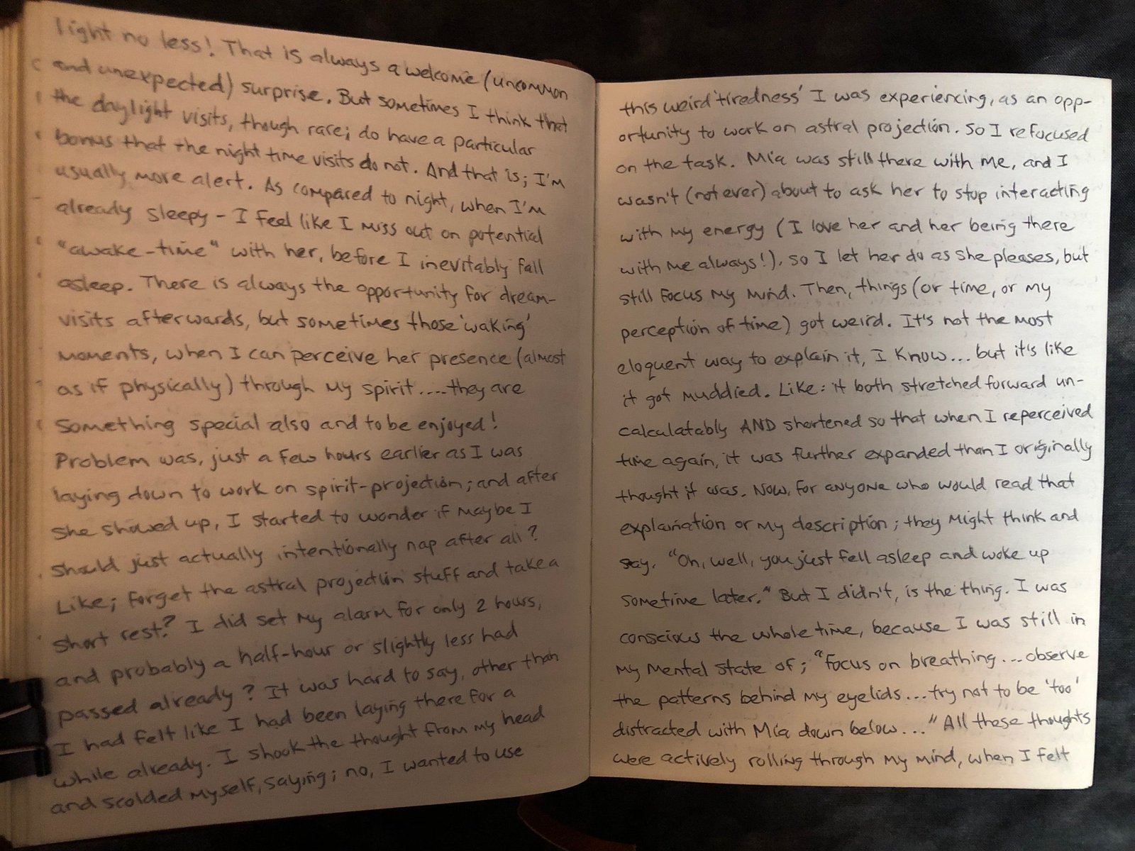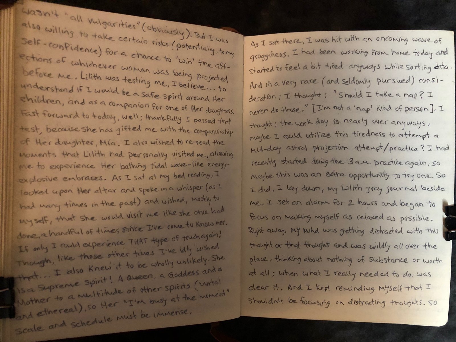 I lay down, my Lilith gray journal beside me. I set an alarm for 2 hours and began to focus on making myself as relaxed as possible. Right away, my mind was getting distracted with this thought or that thought and was wildly all over the place, thinking about nothing of substance or worth at all; when what I really needed to do was clear it. And I kept reminding myself that I shouldn’t be focusing on distracting thoughts. So each time a random thought entered, I would clear it and refocus on the pattern of my breathing. Not ‘making’ my breath follow a pattern (that requires directed concentration), but just breathing normally/naturally and simply observing it happen. That helped pull my mind away from idle thoughts.