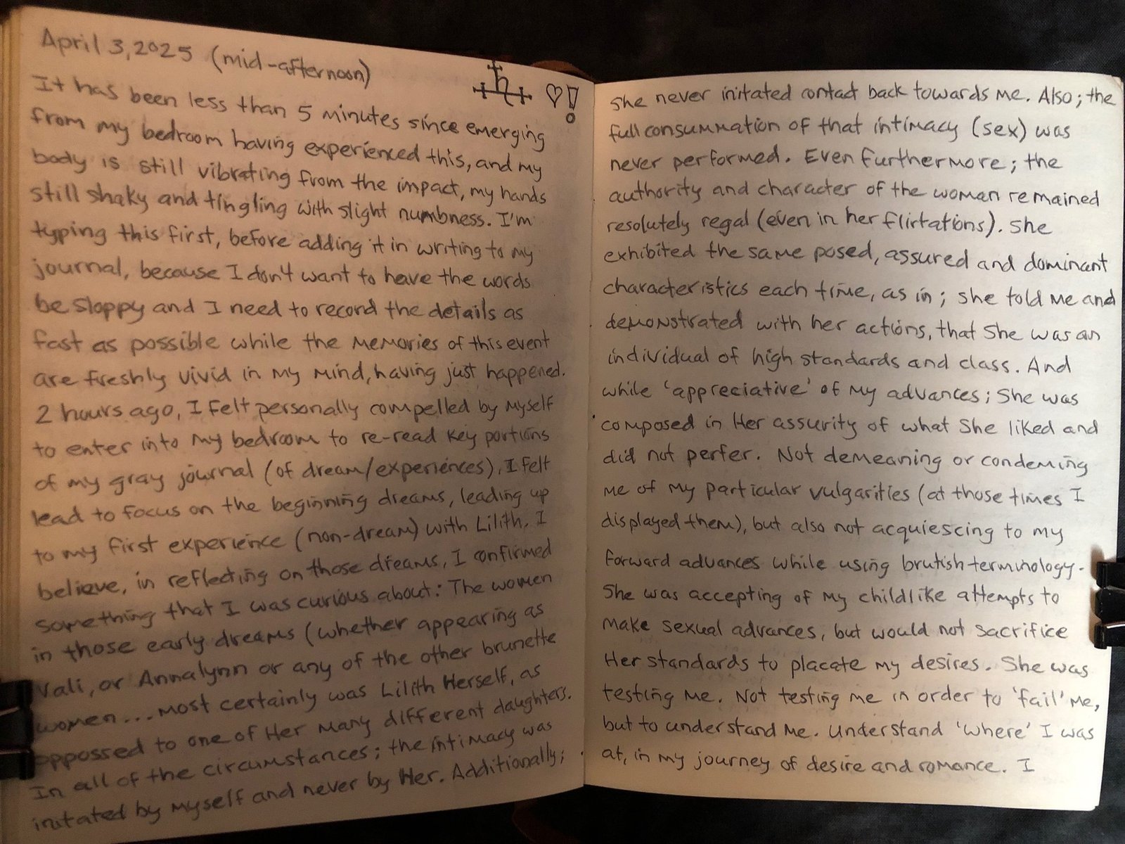 2 hours ago, I felt personally compelled by myself to enter into my bedroom to reread key portions of my gray journal (of dreams/experiences), my mind was singling out the beginning dreams, leading up to my first experience (not a dream) with Lilith. I believe, in reflecting on these dreams, I confirmed something that I had been curious about: The women in those early dreams (whether appearing as Valley, or Annalynn or any of the unknown brunette women…most certainly was Lilith Herself, and not one of Her many different daughters. In all of the circumstances; the attempts of intimacy was initiated by myself and never by Her.