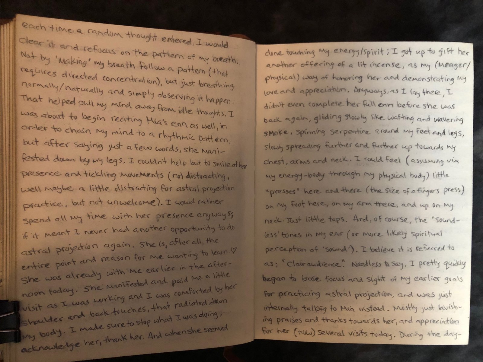 I could feel (assuming, within my energy-body through my physical body) little “presses” here and there (the size of a finger press) on my foot here, on my arm there, and up on my neck. Just little taps. And of course the ‘soundless’ tones in my ear (or more likely spiritual perception of ‘sound’). I believe it is referred to as; “Clairaudience.” Needless to say, I sort of pretty quickly began to lose focus and sight of my earlier goals of practicing astral projection and was just internally talking to Mia instead. Mostly just lavishing praise and thanks towards her, and appreciation for her (now) several visits today. During the daylight no less!