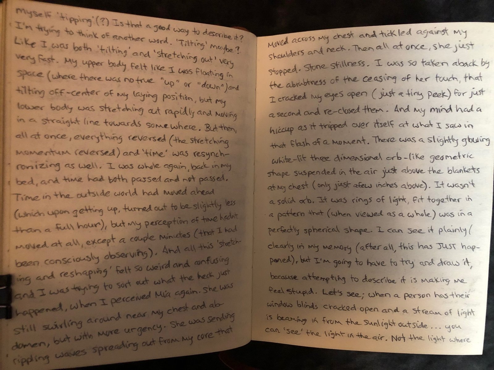 I was so taken aback by the abruptness of the ceasing of her touch, that I cracked my eyelids open (just a tiny little peek) for just a second and re-closed them. And my brain had a hiccup as it tripped over itself at what I saw in that flash of a moment. There was a slightly glowing white-lit three dimensional orb-like geometric shape suspended in the air just above the blankets at my chest.