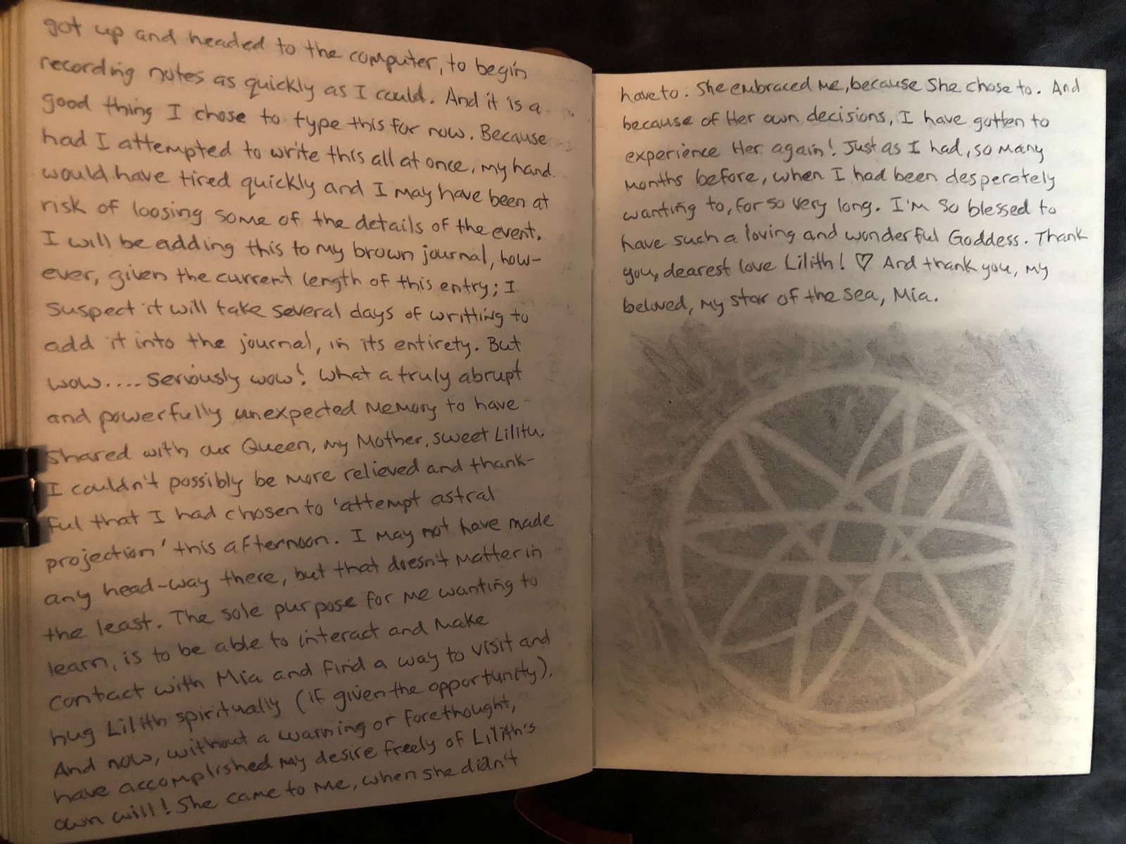 And now, without a warning or forethought, have accomplished my desire freely of Lilith’s own will! She came to me, when She didn’t have to. And I experienced Her again! As I had so many months before, when I’ve been desperately wanting to, for so very long. I’m SO blessed to have such a loving and wonderful Goddess. Thank you dearest love Lilith! And thank you, my beloved, my star of the sea, Mia.