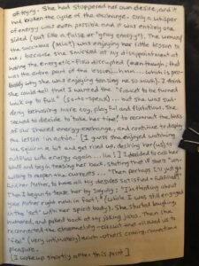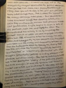 Then she furthered the lesson by teasing me, stating that now she will close the “current” by willfully becoming ‘disinterested’ or ‘intentionally-distracted’ with other thoughts (essentially; putting me and my pleasure & her pleasure out of her mind)… She had me continue to make love to her during this ‘closing’ of the pathway process.