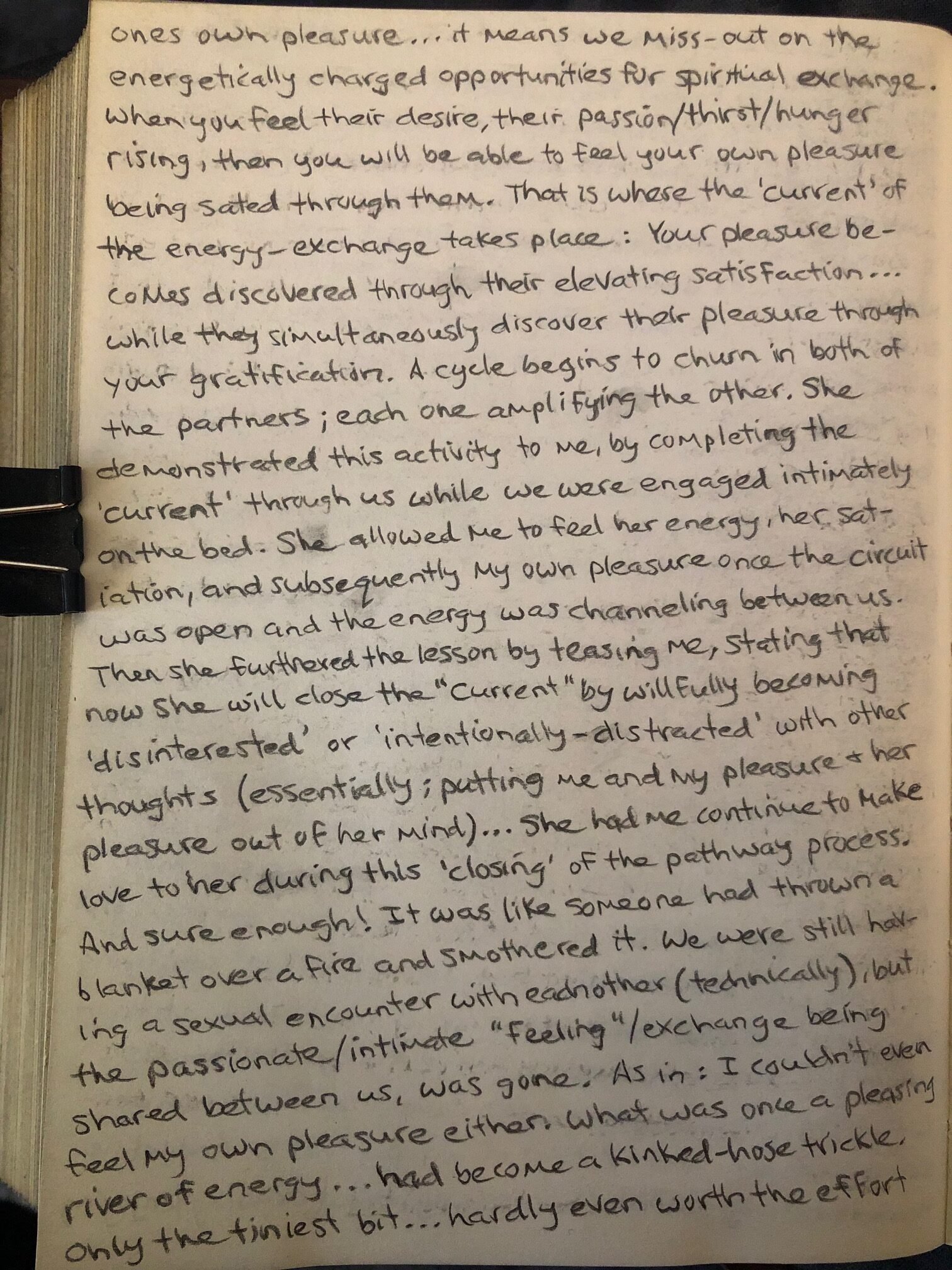 She demonstrated this activity to me, by completing the ‘current’ through us while we were engaged intimately on the bed. She allowed me to feel her energy, her satiation, and subsequently my own pleasure once the circuit was open and the energy was channeling between us.