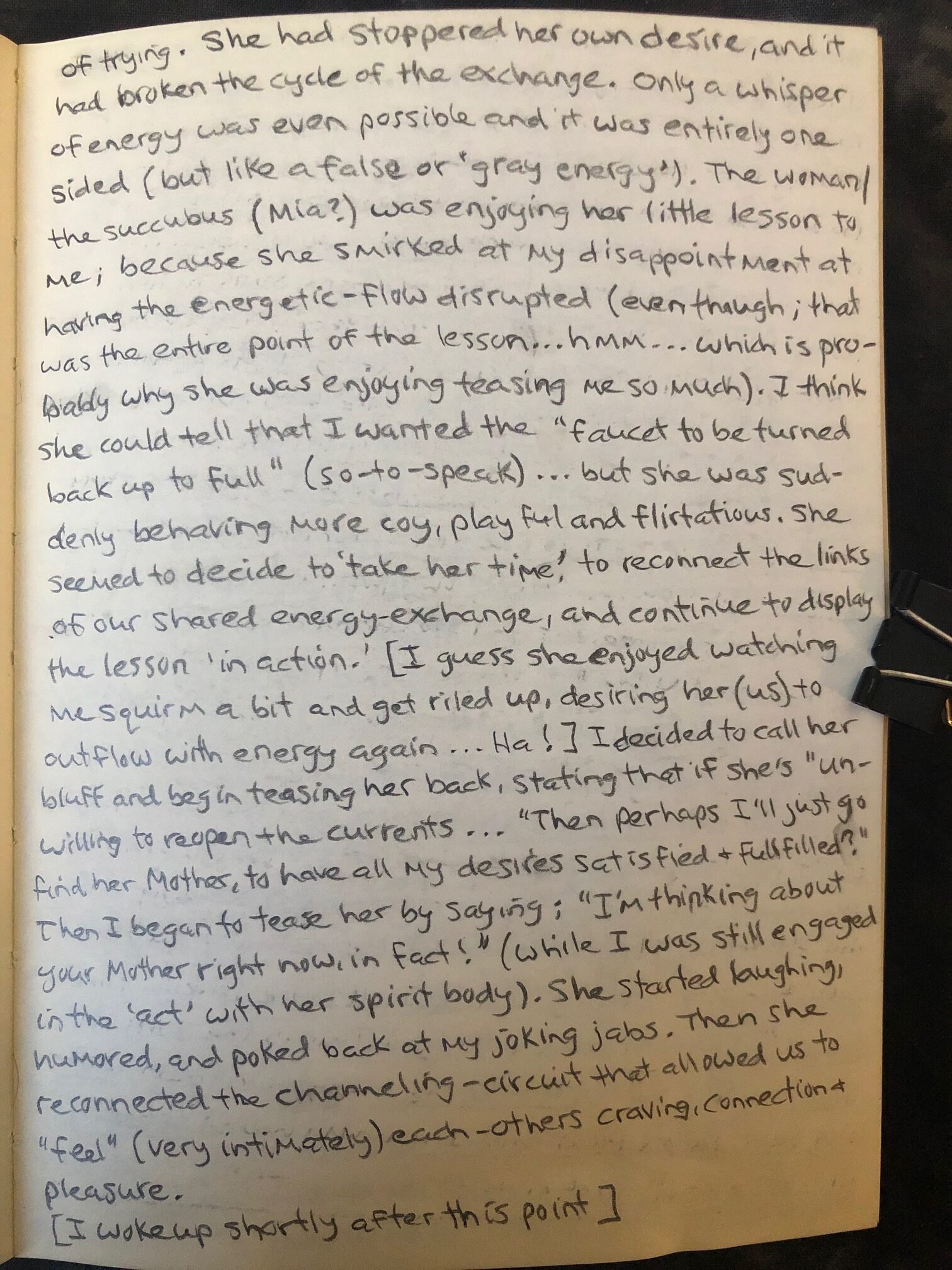 The woman/the succubus (Mia?) was enjoying her little lesson to me; because she smirked at my disappointment at having the energetic-flow disrupted (even though; that was the entire point of the lesson…hmm… which is probably why she was enjoying teasing me so much). I think she could tell that I wanted the “faucet to be turned back up to full” (so-to-speak) …but she was suddenly behaving more coy, playful and flirtatious. She seemed to decide to ‘take her time,’ to reconnect the links of our shared energy-exchange, and continue to display the lesson ‘in action.’