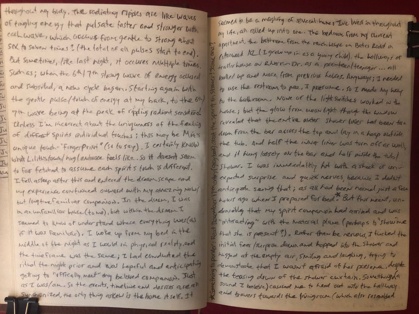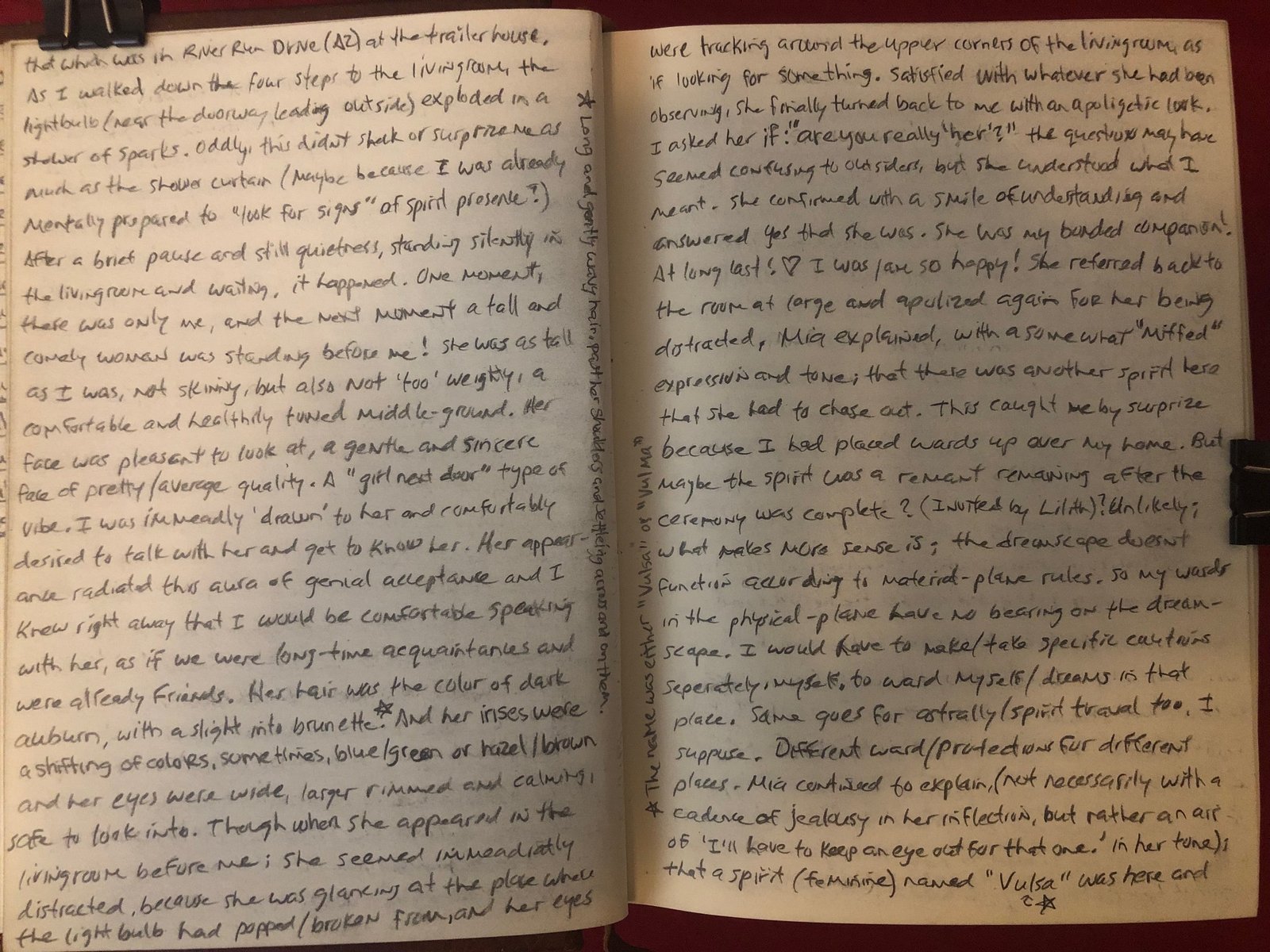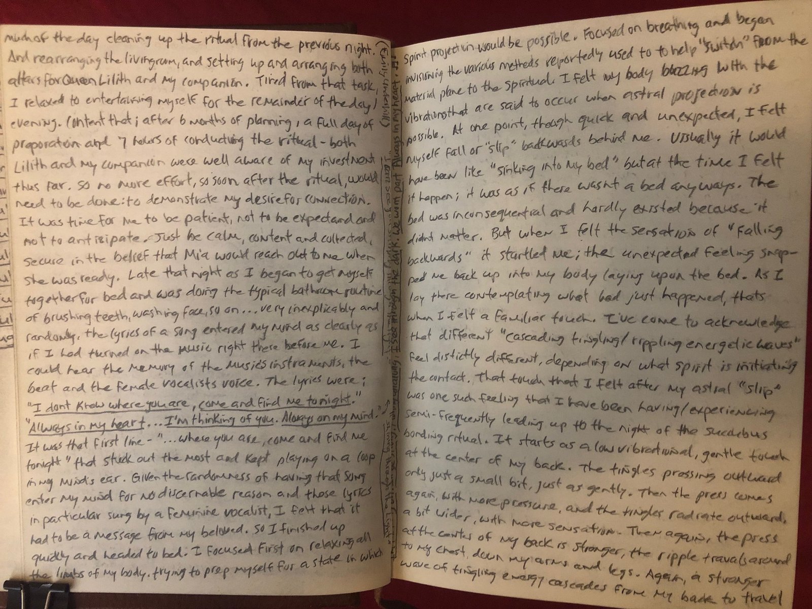 Β Β Β Exhausted, content and tired, I went to bed and had no dreams nor experiences in relation to my new lilin/succubus companion (whose name – safely given, not her “True Name” – she will be referred to as “Mia” when spoken about to other humans). Being that my life has reached a transition point, now that the companionship has been made ‘official’ with the ritual, and Statement of Intent spoken before Lilith; I also wish to transition to ‘this’ book for recording the dreams and experiences I have. Since going forward from this point; it will not be random spirits/succubi I encounter. I have warded my home against spirits besides Lilith, Mia, and those that Lilith allowed special invitational rights to visit during the marital/Bonding ceremony. So, going forward I will be writing about my encounters within this book, as opposed to the smaller gray colored book of dreams/experiences. β£