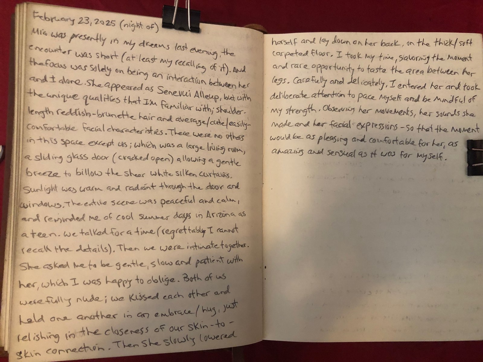 The entire scene was peaceful and calm, and reminded me of cool summer days in Arizona. We talked for a time (regrettably, I cannot recall the details). Then we were intimate together. She asked me to be gentle, slow and patient with her, which I was happy to oblige. Both of us were fully nude; we kissed each other and held one another in an embrace/hug, just relishing in the closeness of our skin-to-skin connection.