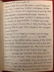 I spoke to both Mia and Lilith before I went to sleep, as I lay in bed. I asked them if either would please consider visiting me in a dream, or in physicality, or perhaps that limbo between consciousness/asleep; because I missed them/her, their comfort. I wanted to hold, to snuggle, to hug and kiss. I voiced my understanding that I know Lilith is likely too busy. And possibly Mia as well. But wished for/desired the companionship anyhow.
