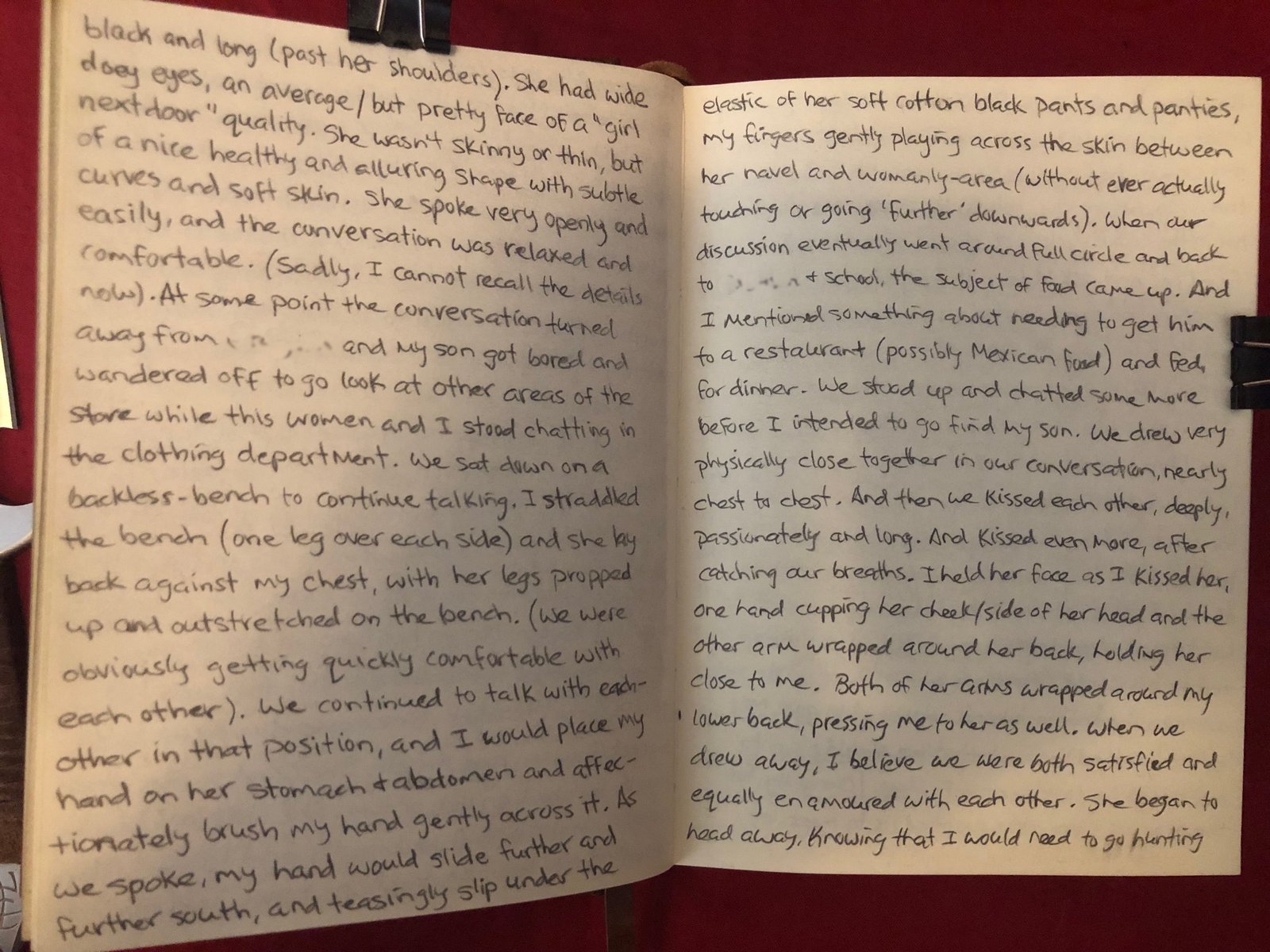 At some point, the conversation turned away from my son and he got bored and wandered off to go look at other areas of the store while this woman and I stood chatting in the clothing department. We sat down on a backless-bench to continue talking, I straddled the bench (one leg over each side) and she lay back against my chest, with her legs propped up and outstretched on the bench. (We were obviously getting quickly comfortable with each other).