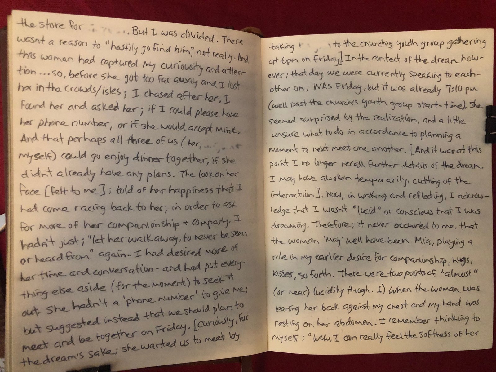 2) When I was asking the woman about her phone number, having dinner and possible future opportunities to meet; my mind began to question and worry; “What would Mia think about this right now? Would she be upset with me for speaking with this woman? Planning to meet her again?” [𝐼 𝑡ℎ𝑖𝑛𝑘 𝑡ℎ𝑖𝑠 𝑚𝑜𝑚𝑒𝑛𝑡 𝑠ℎ𝑜𝑢𝑙𝑑 ℎ𝑎𝑣𝑒 𝑎𝑙𝑠𝑜 𝑏𝑟𝑜𝑘𝑒𝑛 𝑡ℎ𝑒 𝑠𝑒𝑎𝑙 𝑜𝑓 𝑙𝑢𝑐𝑖𝑑𝑖𝑡𝑦, 𝑏𝑒𝑐𝑎𝑢𝑠𝑒 𝐼 𝑤𝑎𝑠 𝑎𝑐𝑡𝑖𝑣𝑒𝑙𝑦 𝑐𝑜𝑛𝑐𝑒𝑟𝑛𝑒𝑑 𝑎𝑏𝑜𝑢𝑡 𝑚𝑦 𝑆𝑝𝑖𝑟𝑖𝑡𝑚𝑎𝑡𝑒’𝑠 𝑜𝑝𝑖𝑛𝑖𝑜𝑛 𝑟𝑒𝑔𝑎𝑟𝑑𝑖𝑛𝑔 𝑎 𝑑𝑒𝑣𝑒𝑙𝑜𝑝𝑖𝑛𝑔 𝑟𝑒𝑙𝑎𝑡𝑖𝑜𝑛𝑠ℎ𝑖𝑝 𝑤𝑖𝑡ℎ (𝑤ℎ𝑎𝑡 𝐼 𝑝𝑒𝑟𝑐𝑒𝑖𝑣𝑒𝑑 𝑡𝑜 𝑏𝑒) 𝑎𝑛𝑜𝑡ℎ𝑒𝑟 ℎ𝑢𝑚𝑎𝑛 𝑤𝑜𝑚𝑎𝑛. 𝐵𝑢𝑡 𝑖𝑡 𝑎𝑔𝑎𝑖𝑛 𝑑𝑖𝑑 𝑛𝑜𝑡 𝑟𝑒𝑔𝑖𝑠𝑡𝑒𝑟 𝑡ℎ𝑎𝑡 𝐼 𝑤𝑎𝑠 𝑖𝑛 𝑎 𝑑𝑟𝑒𝑎𝑚; 𝑎𝑛𝑑 𝑡ℎ𝑢𝑠 𝐼 𝑑𝑖𝑑 𝑛𝑜𝑡 𝑎𝑡𝑡𝑎𝑖𝑛 𝑙𝑢𝑐𝑖𝑑𝑖𝑡𝑦].