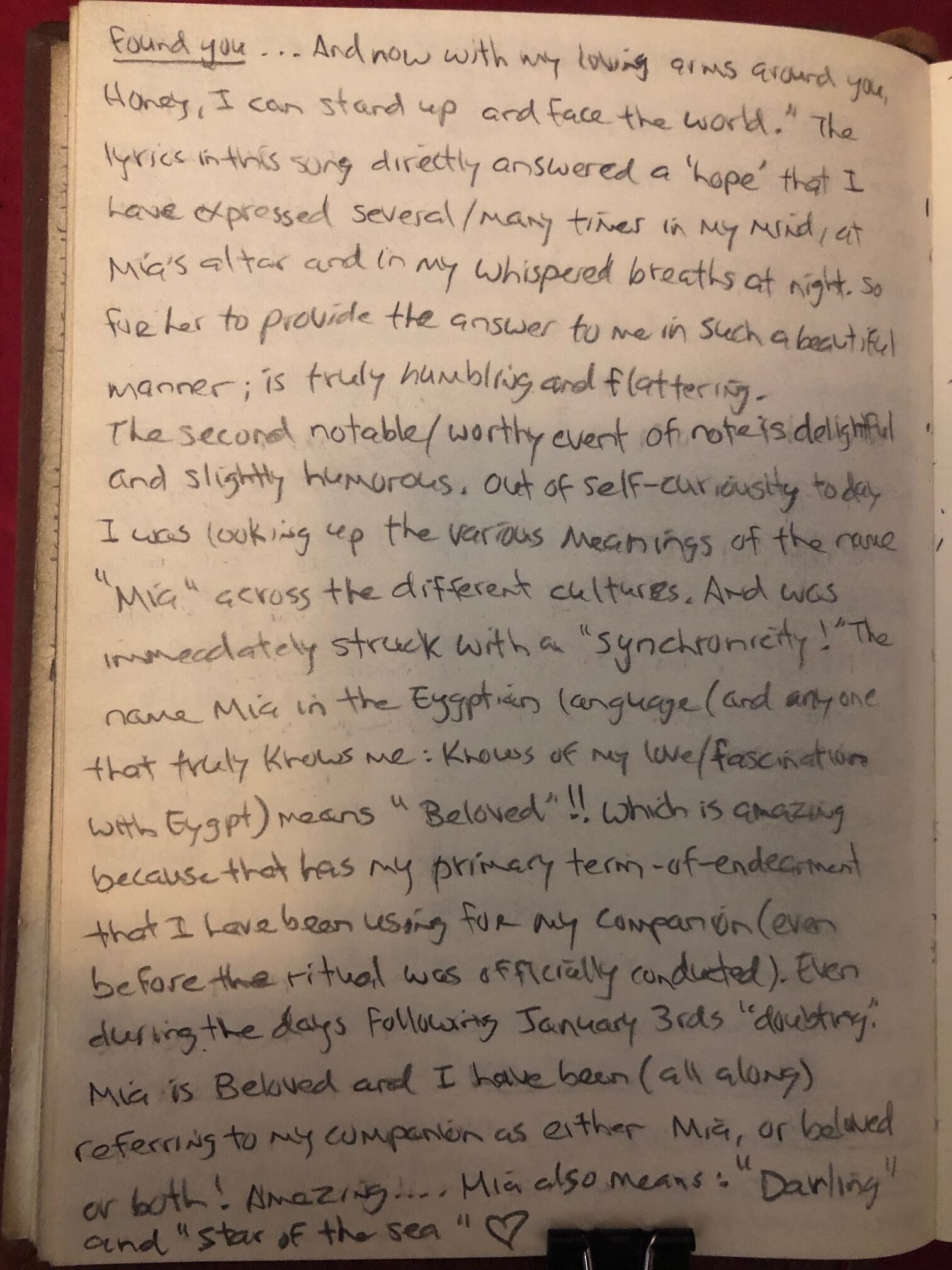 Β Β Β Out of self-curiosity today, I was looking up the various meanings of the name “Mia” across the different cultures. And was immediately struck with a “synchronicity”! The name Mia in the Egyptian language (and anyone that truly knows me: knows of my love/fascination with Egypt) means “Beloved”!! Which is amazing, because that has been my primary term-of-endearment that I have been using for my companion (even before the ritual was officially conducted). Even during the days following January 3rds ‘doubting.’ β£