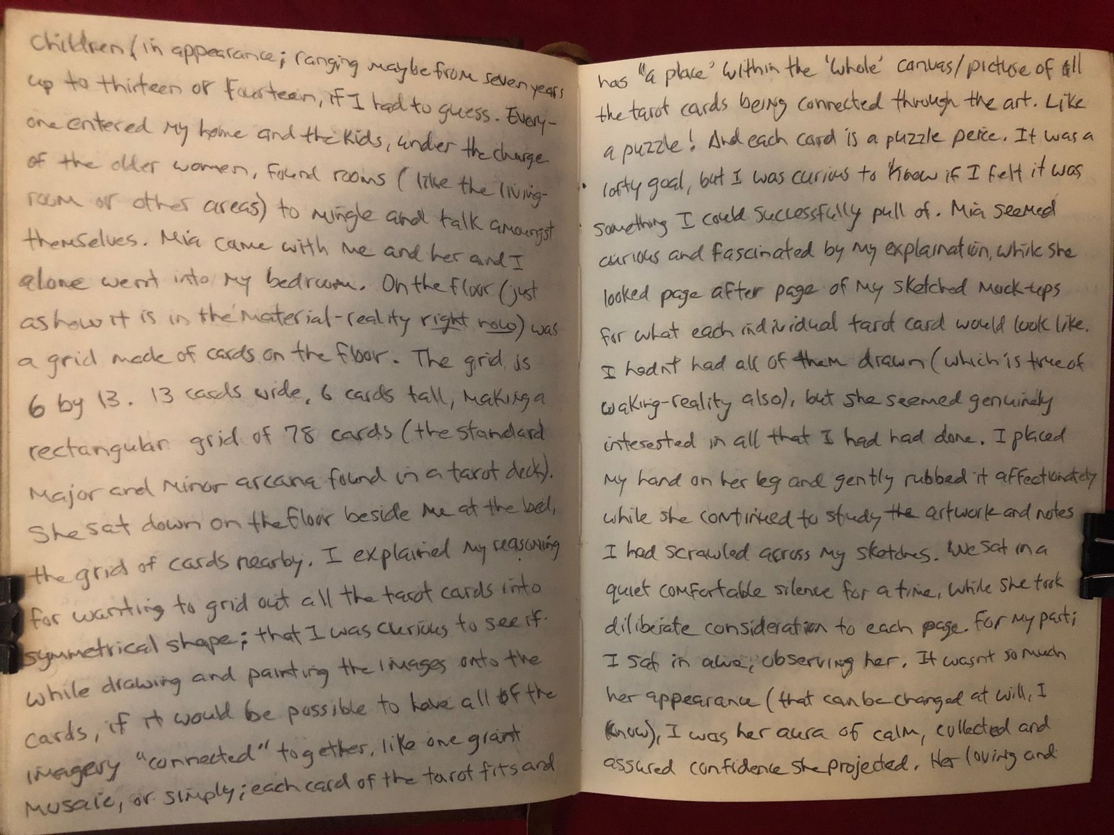 It was a lofty goal, but I was curious to know if I felt it was something I could successfully pull off. Mia seemed curious and fascinated by my explanation, while she looked page after page of my sketched mockups for what each individual tarot card would look like. I hadn’t had all of them drawn (which is true of waking-reality also), but she seemed genuinely interested in all that I had done thus far.