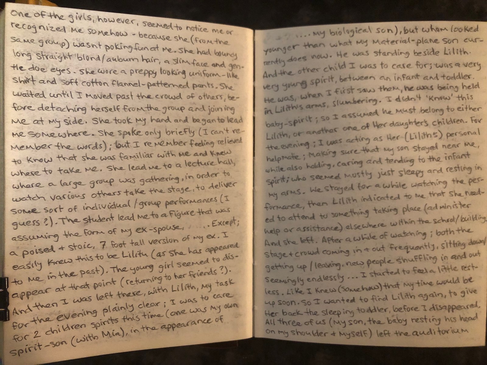 For the evening; I was acting as Her (Lilith’s) personal helpmate; making sure that my son stayed near me. While also holding, caring and tending to the infant spirit, who seemed mostly just sleepy and resting in my arms. We stayed for a while watching the performance, then Lilith indicated to me that she needed to attend to something taking place (administer help or assistance) elsewhere within the school/building. And she left.