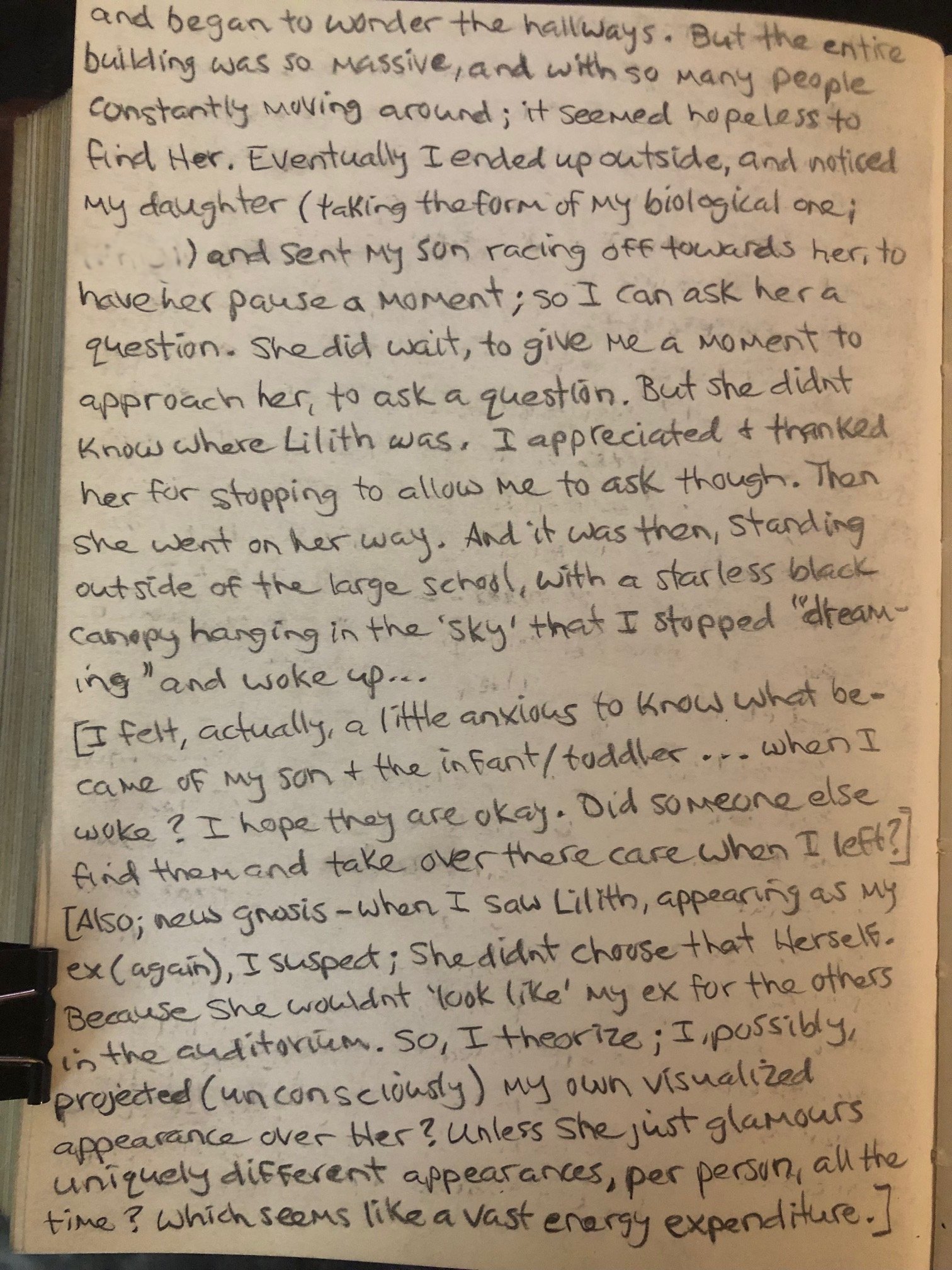 All three of us (my son, the baby resting his head on my shoulder & myself) left the auditorium and began to wander the hallways. But the entire building was so massive, and with so many people constantly moving around; it seemed hopeless to find Her. Eventually I ended up outside, and noticed my daughter (taking the form of my biological one) and sent my son racing off towards her, to have her pause a moment; so I can ask her a question. She did wait to give me a moment to approach her, to ask a question. But she didn’t know where Lilith was.