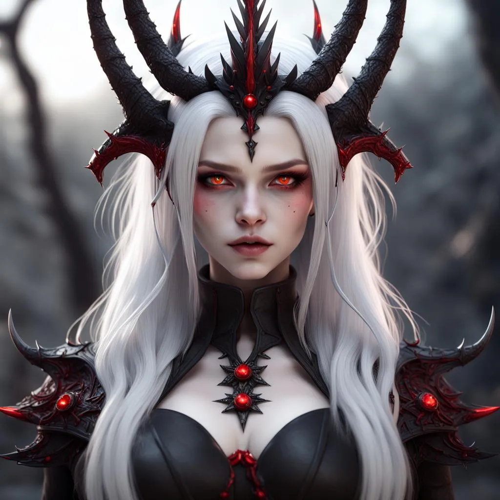 An extraordinary, unique-appearance woman with long lower-back length hair. Half of which was pulled up into a ponytail (while the rest was loose and falling across her shoulders). Stylish bangs. Ultra-pure white color (extremely smooth, shiny silky white) with very thick streaked sections of shimmering deep dark-wine/scarlet red.