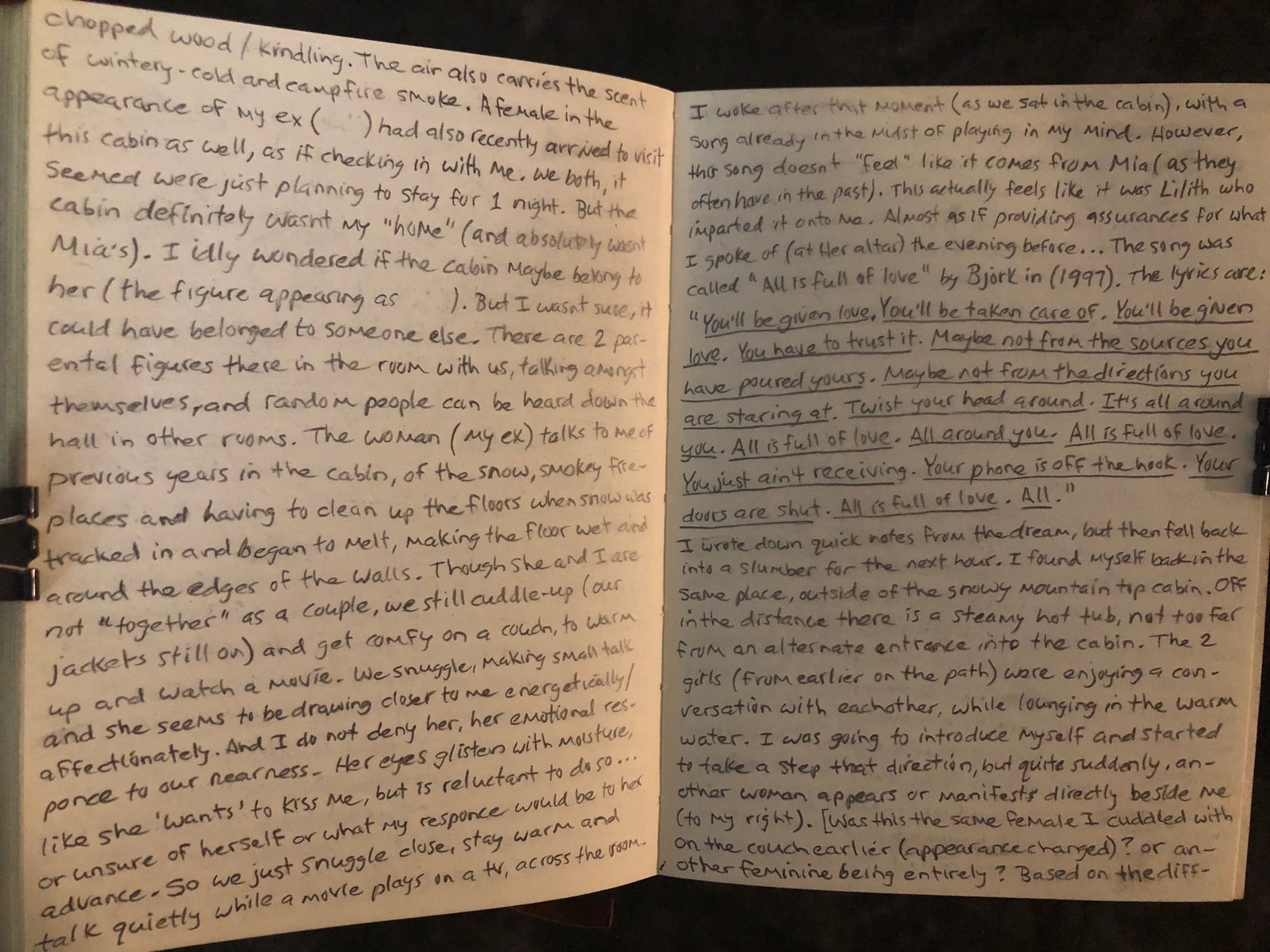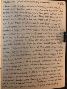 The woman talks to me of previous years in the cabin, of the snow, smokey fireplaces and having to clean up the floors when snow was tracked in and began to melt, making the floor wet and around the edges of the walls. Though she and I are not “together” as a couple, we still cuddle-up (our jackets still on) and get comfy on a couch, to warm up and watch a movie. We snuggle, making small talk and she seems to be drawing closer to me energetically/ affectionately.