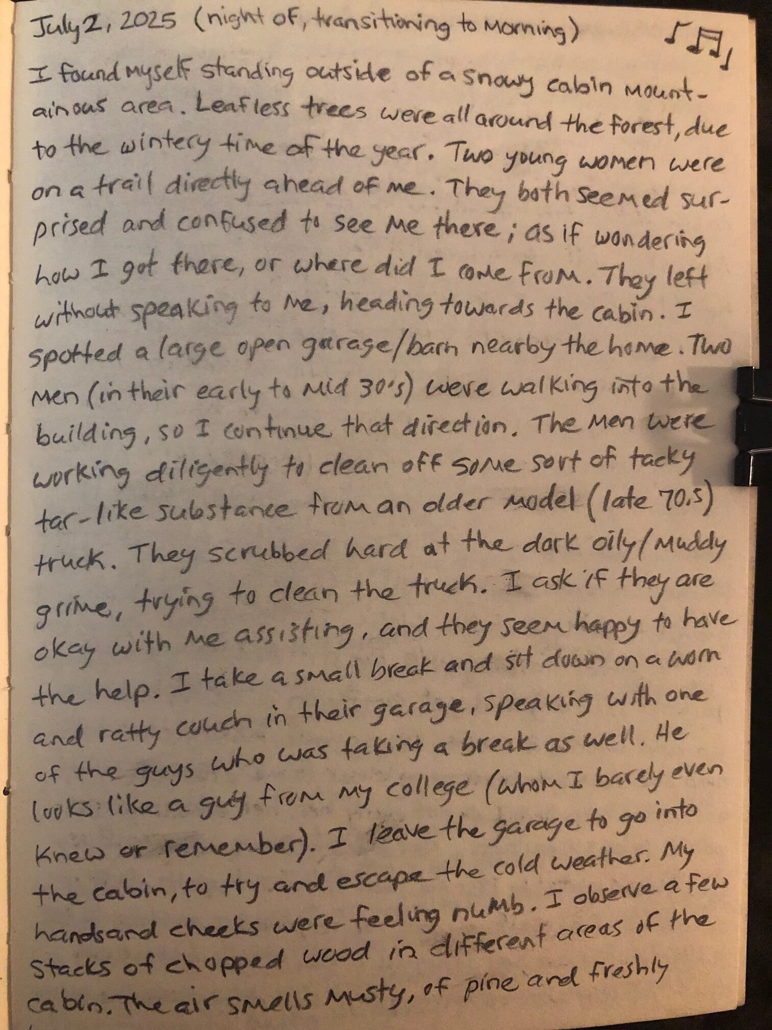 I ask if they are okay with me assisting, and they seem happy to have the help. I take a small break and sit down on a worn and ratty couch in their garage, speaking with one who was taking a break as well. He looks like a guy from my college (whom I barely even knew or remember). I leave the garage to go into the cabin, to try and escape the cold weather. My hands and cheeks were feeling numb.