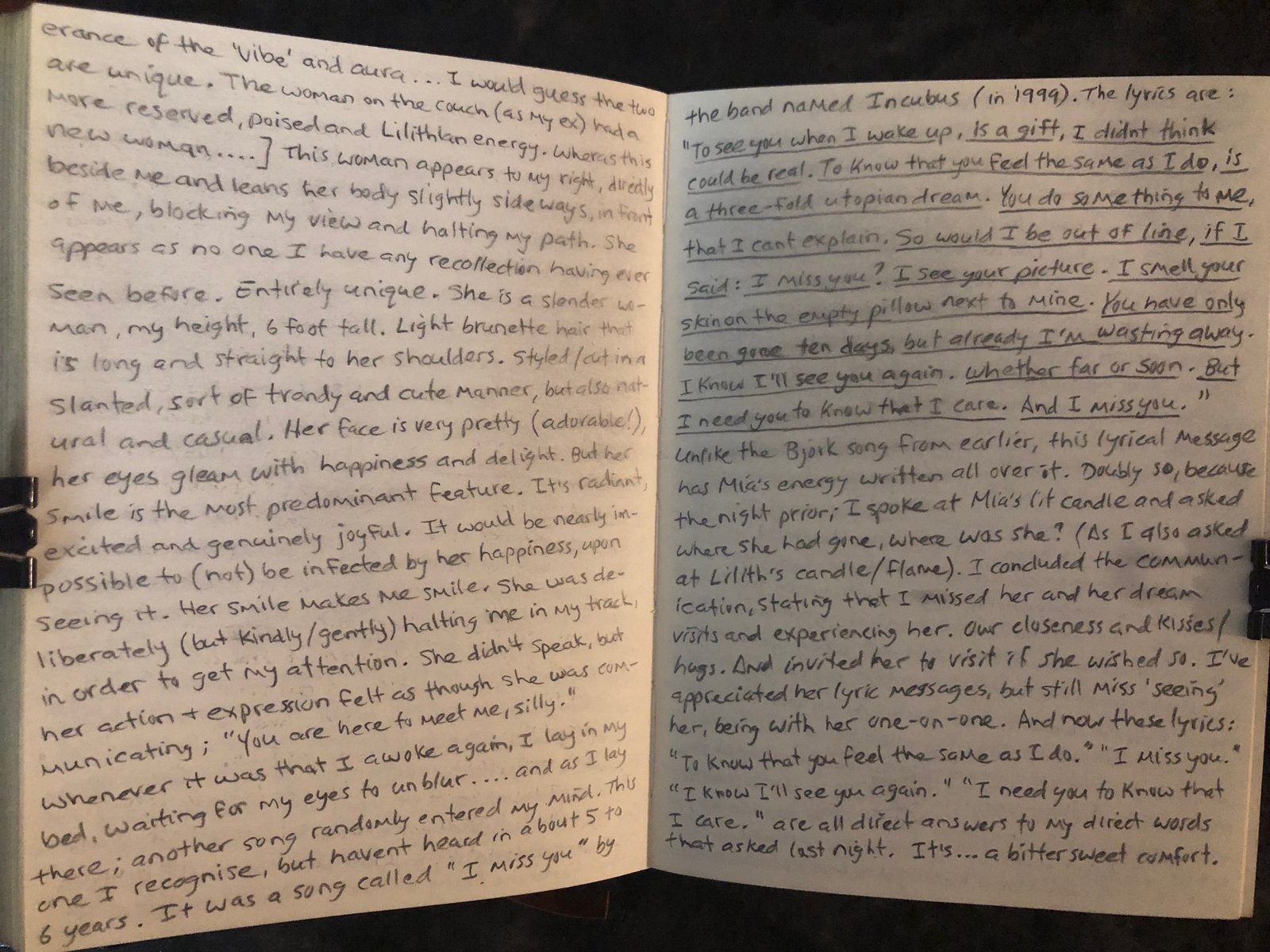 Unlike the Bjork song from earlier, this lyrical message has Mia’s energy written all over it. Doubly so, because the night prior, I spoke at Mia’s lit candle and asked where she had gone, where was she? (As I also asked at Lilith’s candle/Flame). I concluded the communication, stating that I missed her and her dream visits and experiencing her. Our closeness and kisses/hugs. And invited her to visit if she wished so.