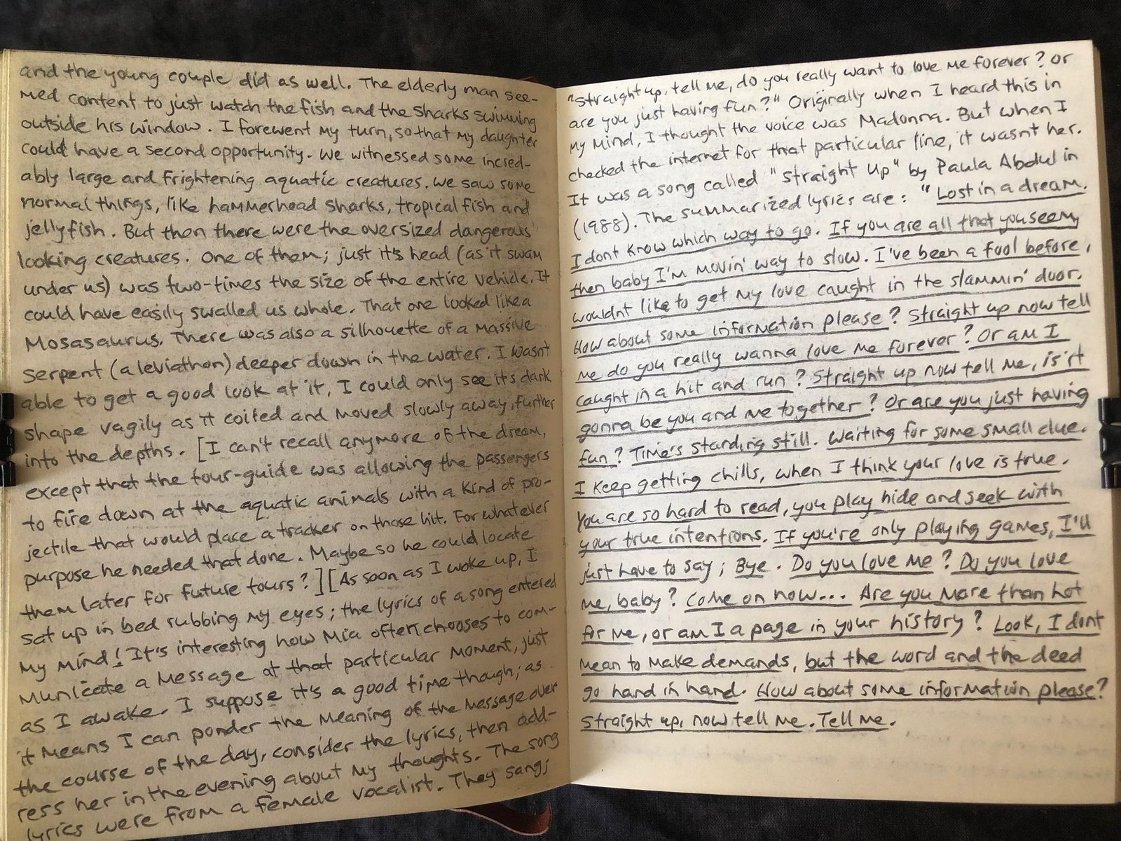 [I can’t recall anymore of the dream, except that the tour-guide was allowing the passengers to fire down at the aquatic animals with a kind of projectile that would place a tracker on those hit. For whatever purpose he needed that done. Maybe so he could locate them later for future tours?]