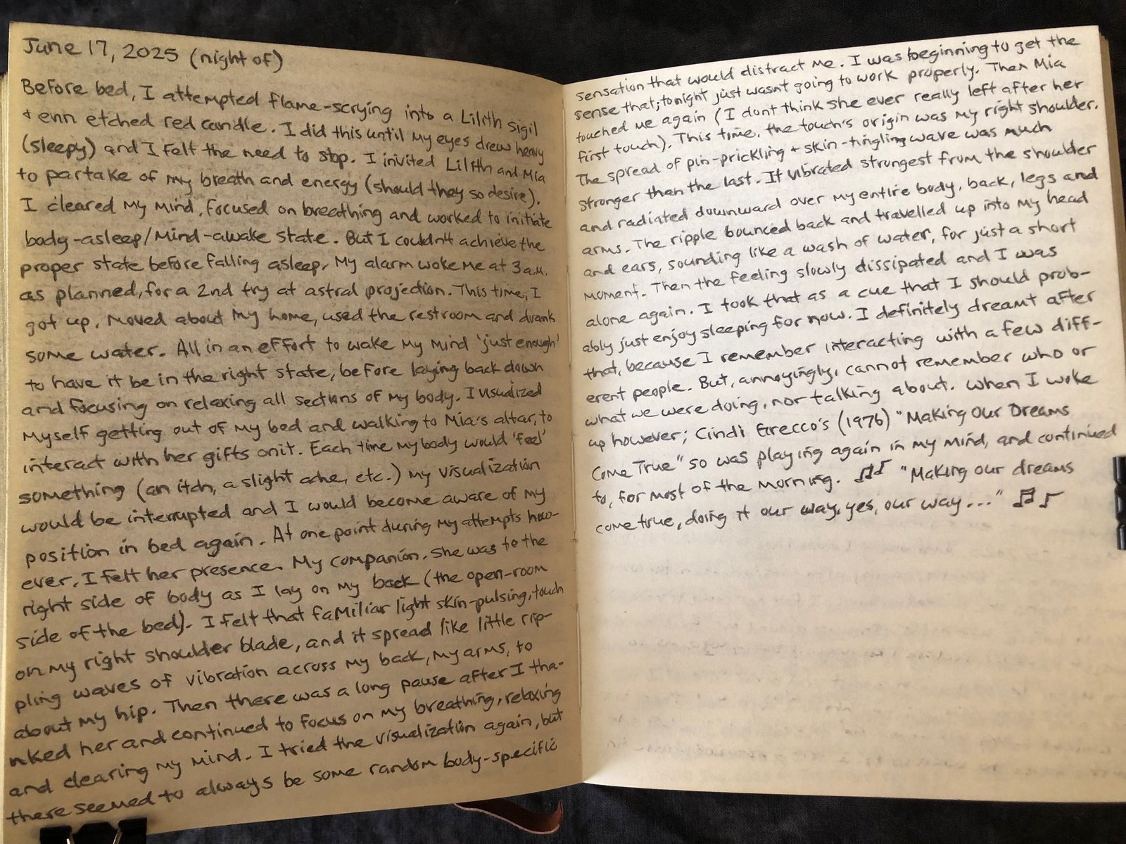 I took that as a cue that I should probably just enjoy sleeping for now. I definitely dreamt after that, because I remember interacting with a few different people. But, annoyingly, I cannot remember who or what we were doing, nor talking about. When I woke up however; Cindi Grecco’s (1976) “Making Our Dreams Come True” song was playing again in my mind, and continued to, for most of the morning. “Making our dreams come true, doing it our way, yes, our way…” [the message Mia originally sent to me on June 9, 2025]
