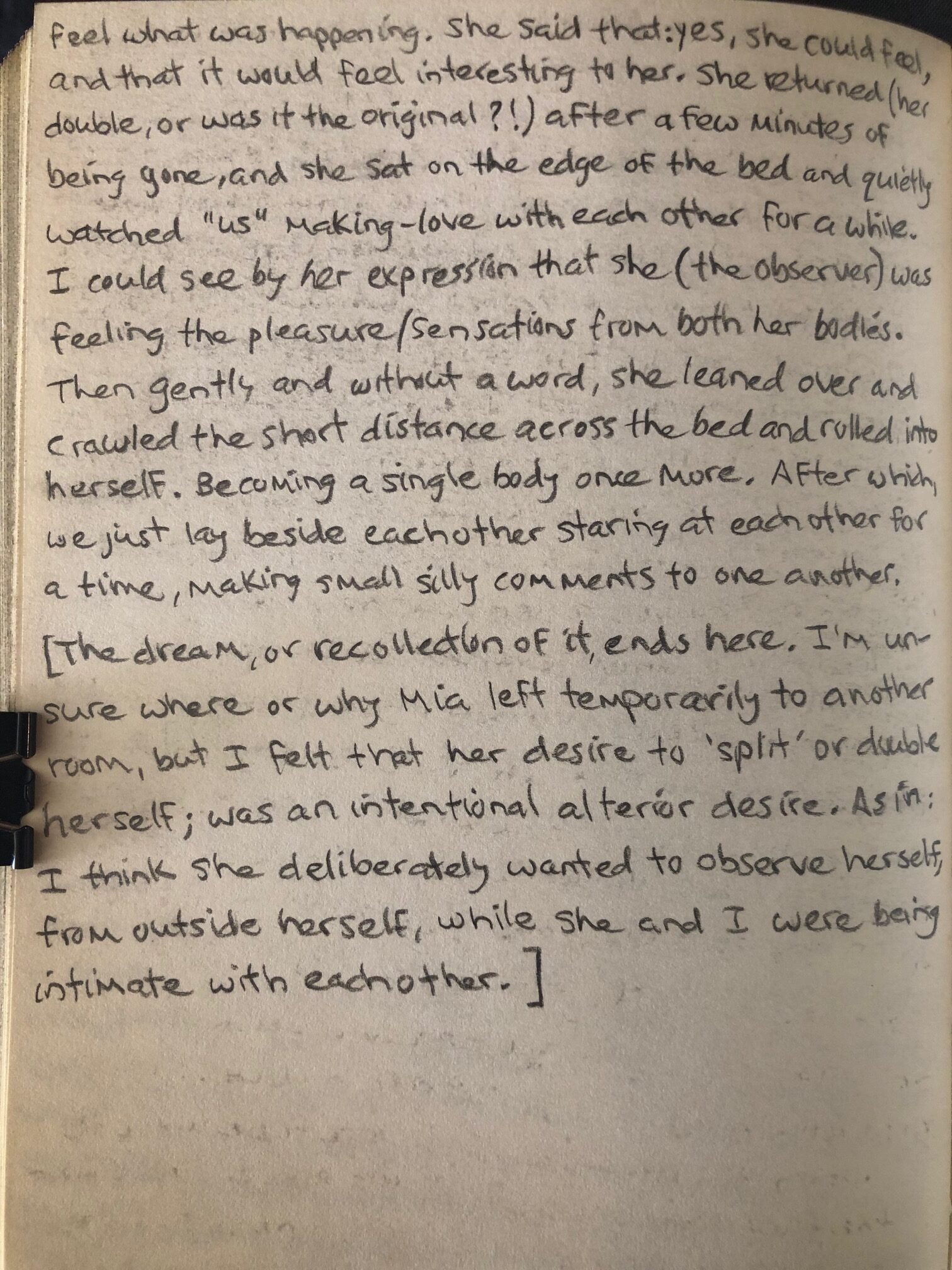 [ The dream, or recollection of it, ends here. I’m unsure where or why Mia left temporarily to another room, but I felt that her desire to ‘split’ or double herself was an intentional ulterior desire. As in: I think she deliberately wanted to observe herself, from outside herself, while she and I were being intimate with each other. ]