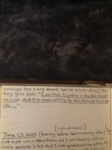 In the morning when I woke, I offered her an incense as I usually do, and thanked her again for her visit. Ensuring that I’ll be sure to add the encounter into our journal. Again, I reiterated that if there was something I could do to bring her happiness, comfort or joy; by any means let me know; and if it was in my power to provide, I would do so. As I sat there at her altar thinking about the previous night, the lyrics of a song she had sent me a while ago, re-entered my mind. [ She does this often, I’ve observed. She will call to mind the lyrics of previous songs she has shared with me; as if trying to re-communicate a message, from a song already familiar to both of us. ]   The song lyrics said: