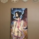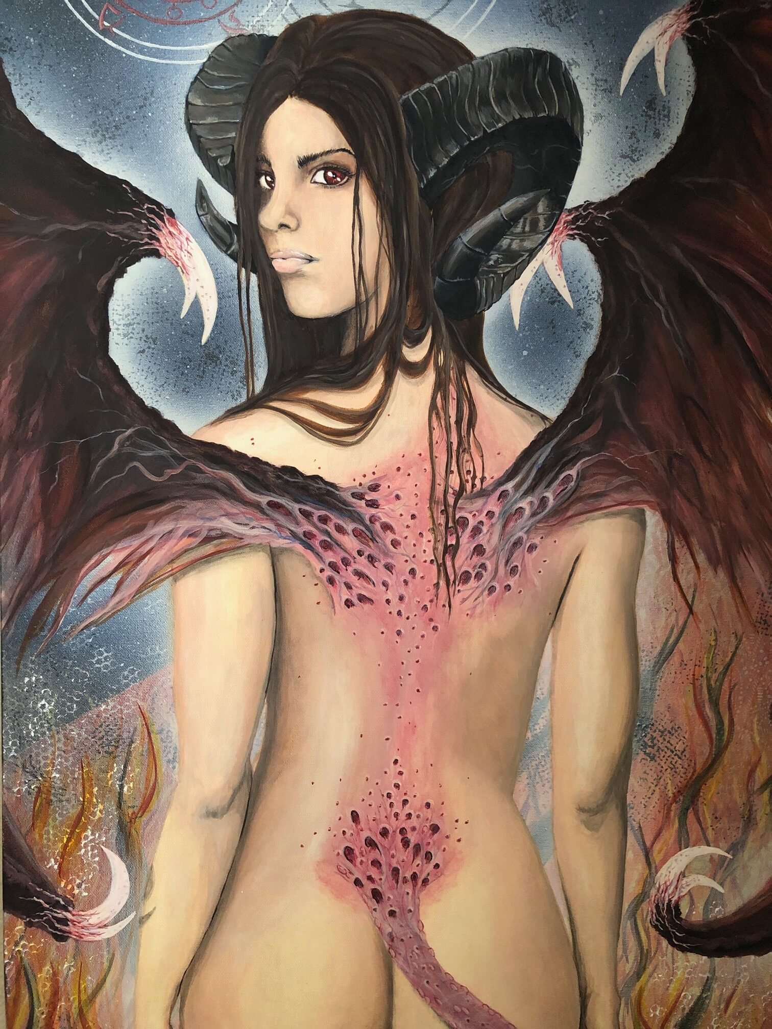 I finished my succubus painting (on a 4 foot by 2 foot canvas). As my final step, I wanted to add my blood into the irises of the painting. In essence; desiring to ‘give life’ and my own personal vitality to the painted imagery of the succubi. A tribute to all of their kind. Unlike other paintings in the past in which I’ve added my blood, my purpose was completely different this time.