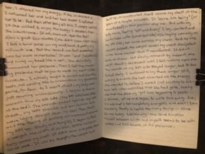 Then there was the feeling of drifting-air movement around my left leg. Slowly and tangibly I began to feel a weight, the width of an arm, settle horizontally across my chest. It didn’t come and press all at once. It was as though; the weight had built up, or constructed itself across my chest in the span of a couple minutes. It came into being (or manifested) in that position atop me. And with my body numb; feeling ‘soft and fuzzy’ I lay, content and comfortable with (what felt like) Mia laying warmly on my left side, her arm across my chest.
