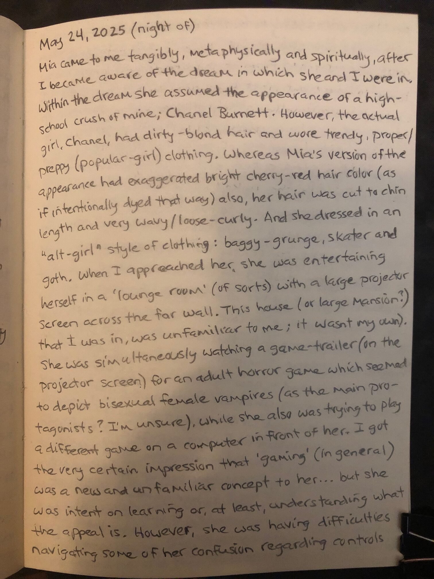 Mia came to me tangibly, metaphysically and spiritually, after I became aware of the dream in which she and I were in. Within the dream she assumed the appearance of a high school crush of mine; Chanel Burnett. However, the actual girl, Chanel, had dirty-blond hair and wore trendy, proper/preppy (popular-girl) clothing. Whereas Mia’s version of the appearance had exaggerated bright cherry-red hair color (as if intentionally dyed that way) also, her hair was cut to chin length and very wavy/loose-curly. And she dressed in an “alt-girl” style of clothing: baggy-grunge, skater and goth.