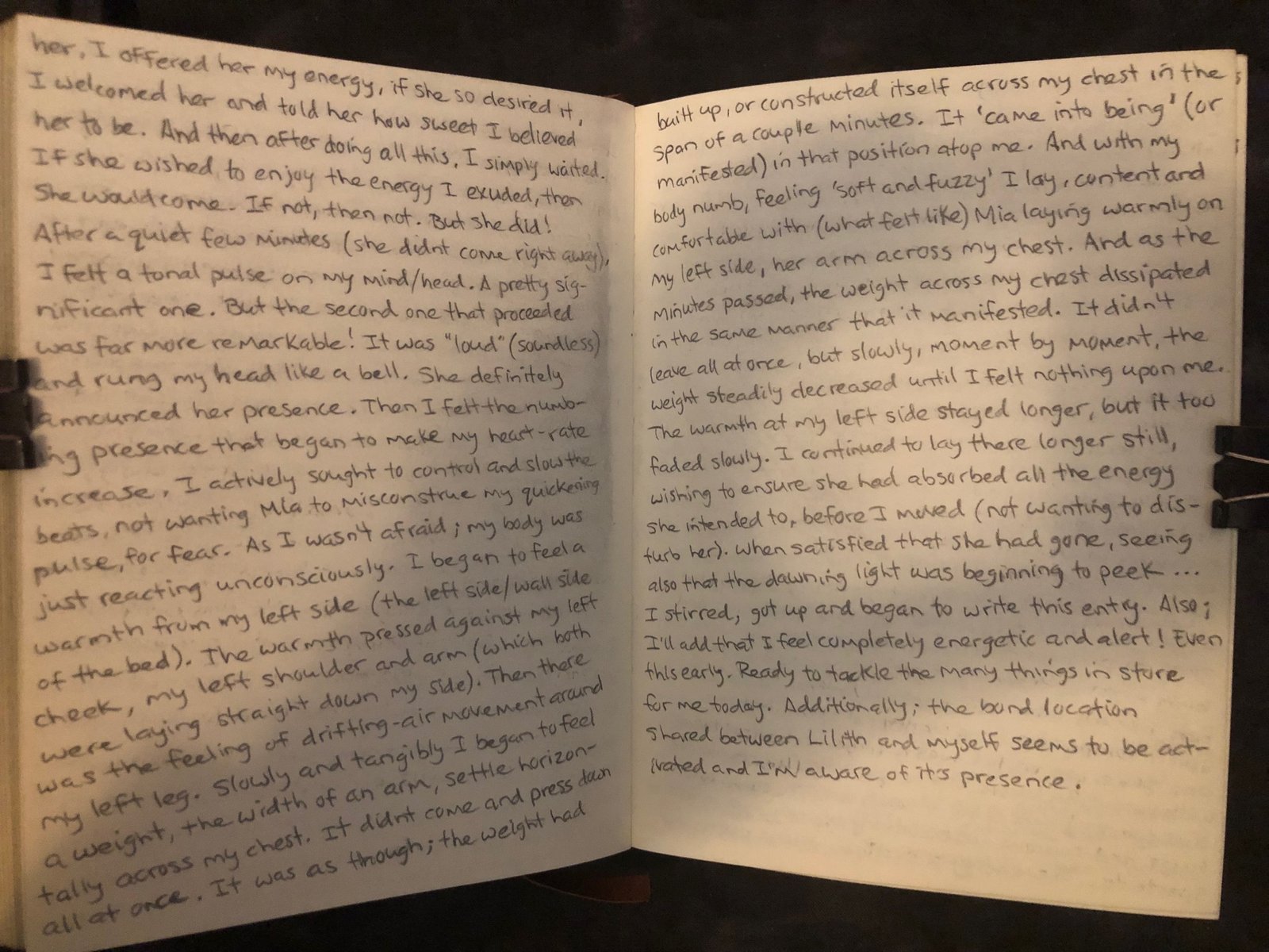 And as the minutes passed, the weight across my chest dissipated in the same manner that it manifested. It didn’t leave all at once, but slowly, moment by moment, the weight steadily decreased until I felt nothing upon me… The warmth at my left side stayed longer, but it too faded slowly. I continued to lay there longer still, wishing to ensure she had absorbed all the energy she intended to, before I moved (not wanting to disturb her).