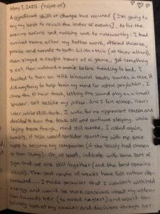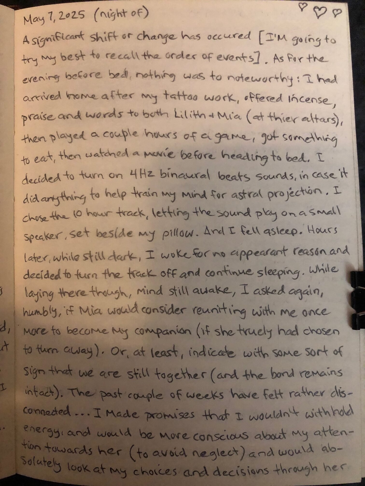 Hours later, while still dark, I woke for no apparent reason and decided to turn the track off and continue sleeping. While laying there though, mind still awake, I asked again, humbly, if Mia would consider reuniting with me once more to become my companion (if she truly had chosen to turn away). Or, at least, indicate with some sort of sign that we are still together (and the Bond remains intact).