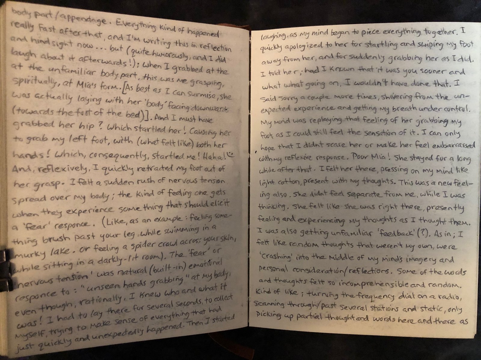 I told her; had I known that it was you sooner and what going on, I wouldn’t have done that. I said sorry a couple more times, shivering from the unexpected experience and getting my breath under control. My mind was replaying that feeling of her grabbing my foot, as I could still feel the sensation of it. I can only hope that I didn’t scare her or make her feel embarrassed with my reflexive response. Poor Mia!