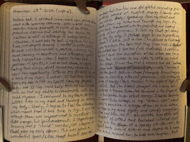 Before bed, I crushed some more rose petals to be used in the upcoming ceremony. After a brief conversation saying good night to Lilith at Her altar; providing incense and inviting Her and/or Her children to visit in exchange of energy/breath/affections, I then went to my bed. I lay there for some time and despite knowing I needed to wake up early for work – still felt inclined to practice calming my mind, focusing on breathing and attempting spirit/ body separation.
