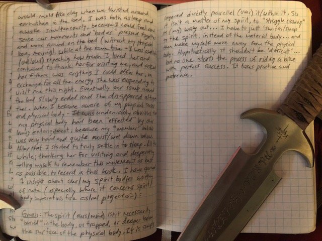 Eventually our romp around the bed slowly ended and she disappeared all together. When I became aware of my physical senses and physical body – it was undeniably obvious that my material body had been “affected” by our loving entanglement. Because my ‘member’ below was very hard down there. After that, I started to truly settle into sleep. All the while; thanking her for visiting and desperately telling myself to remember this moment as best as possible, to record in this book.