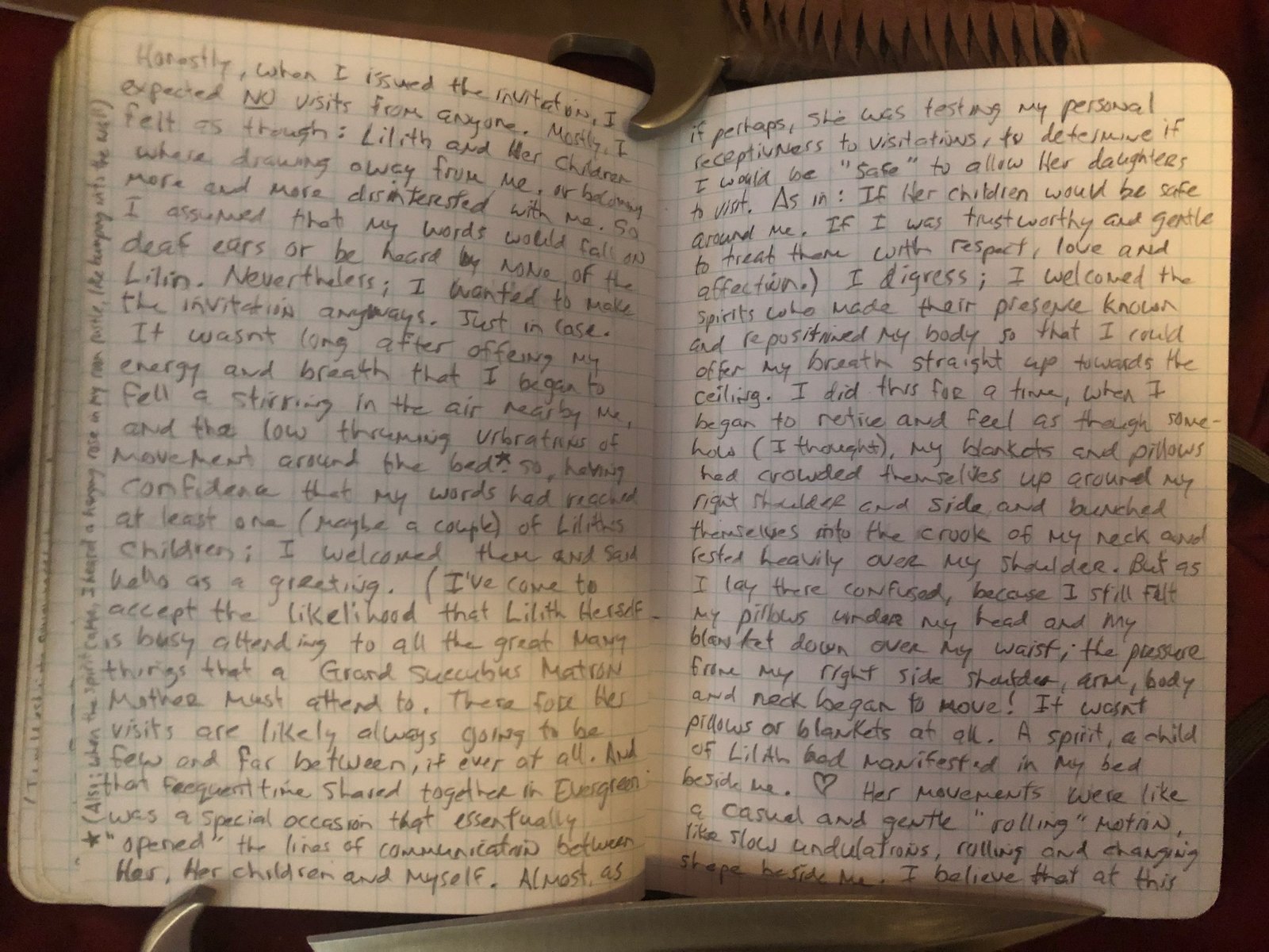 ย ย ย Honestly, when I issued the invitation I expected no visits from anyone. Mostly I felt as though: Lilith and Her children were drawing away from me or becoming more and more disinterested with me. So I assumed that my words would fall on deaf ears, or be heard by none of the Lilim. Nevertheless; I wanted to make the invitation anyway. Just in case. It wasn’t long after offering my energy and breath that I began to feel a stirring in the air near by me, and the low-thrumming vibrations of movement around the bed. (Also; when the spirit came, I heard a hanging rose in my room rustle, like bumping into the wall)