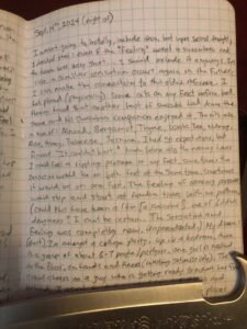 The oils are a mix of: Almond, Bergamot, Thyme, White Tea, Nutmeg, Rose, Honey, Tuberose and Jasmine. I had no expectations, but figured; “It couldn’t hurt.” Much later into the evening hours I could feel a rippling pressure on my feet. Sometimes the sensation would be on both feet at the same time, sometimes it would be on one foot. The feeling of moving pressure would stop and start at random times with no pattern. (~The sensation made my feet and toes involuntarily tense and relax in a quick manner, as if being massaged from the inside?~)