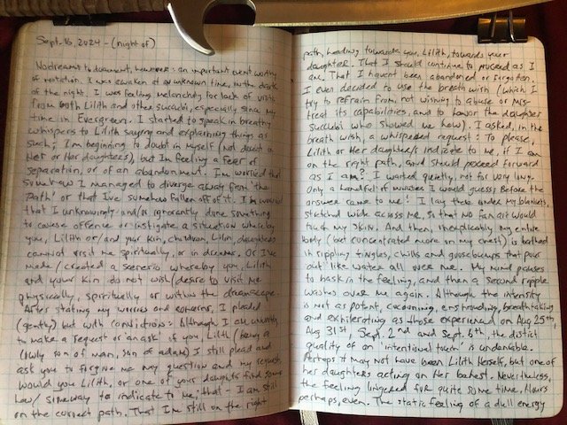 No dreams to document, however: An important event worthy of notation. I was awoken at an unknown time, in the dark of the night. I was feeling melancholy for lack of visits from both Lilith and the other succubi, especially since my time in Evergreen. I started to speak in a breathy whisper to Lilith, saying and explaining things as such; I’m beginning to doubt in myself (not doubt in Her or Her daughters), but I’m feeling a fear of separation, or of an abandonment.