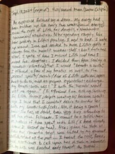 ย ย ย My energy has been building up for nearly two weeks (erotic-energy) since the night of Lilith/Her daughter’s and Na’amah’s communion/introduction. After spending roughly 5 hours working on Lilith’s painting, I went to bed. I woke up around 3:00 a.m. and decided to move Lilith’s gifts and offerings from the moonlit window-shelf back onto Her altar. I spoke of how I missed Lilith and I missed her daughters. I decided then (upon feeling a soundless-vibration) that I would ‘breathe a Wish.’ โฃ
