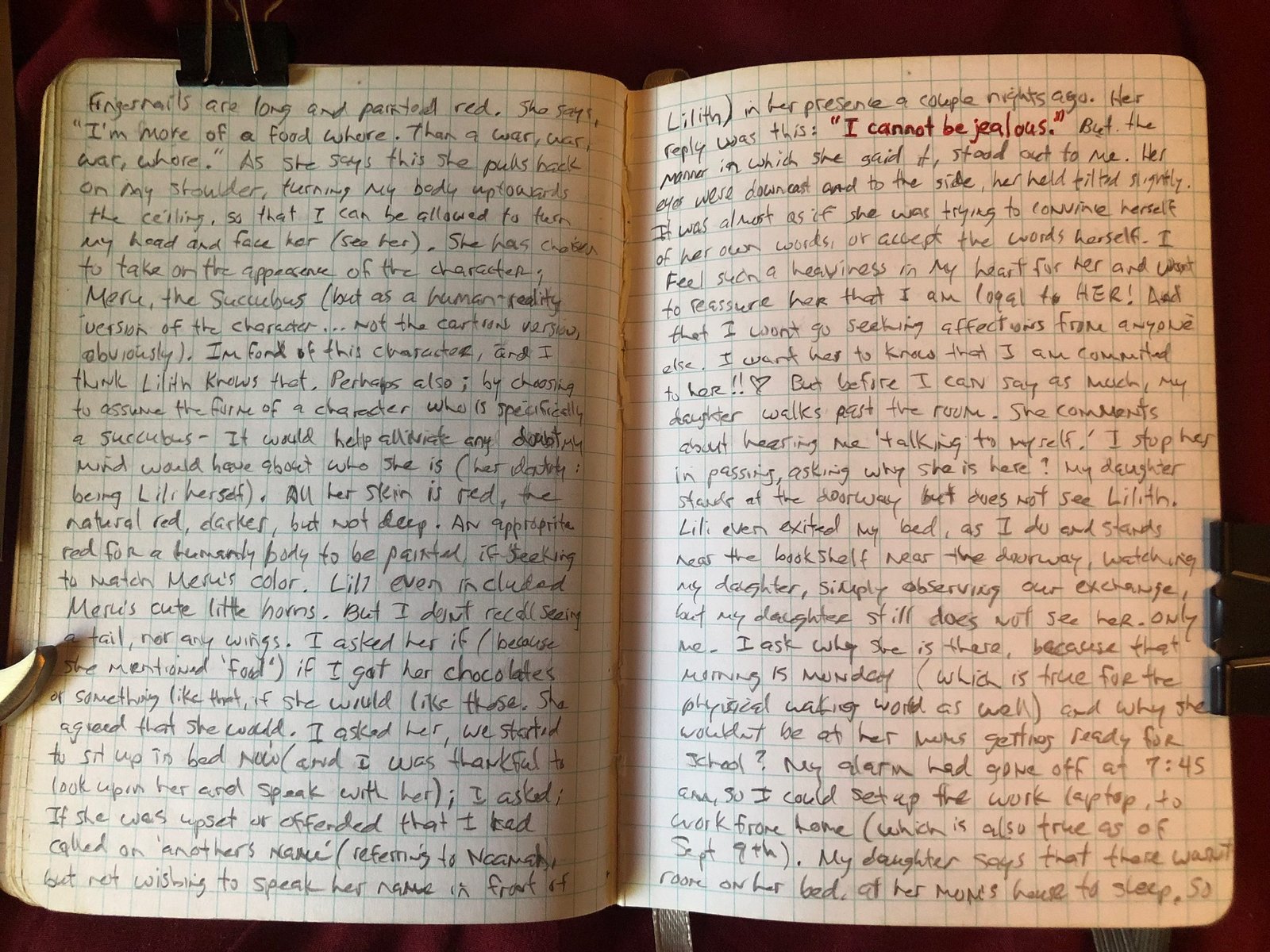 Β Β Β But before I can say as much, my daughter walks past the room. She comments about hearing me ‘talking to myself.’ I stop her in passing, asking why she is here? My daughter stands at the doorway but does not see (or acknowledge?) Lilith. Lili even exits my bed as I do and stands near the bookshelf near the doorway, watching my daughter. Simply observing our communication/exchange. But my daughter still does not glance towards Her. Only me. β£